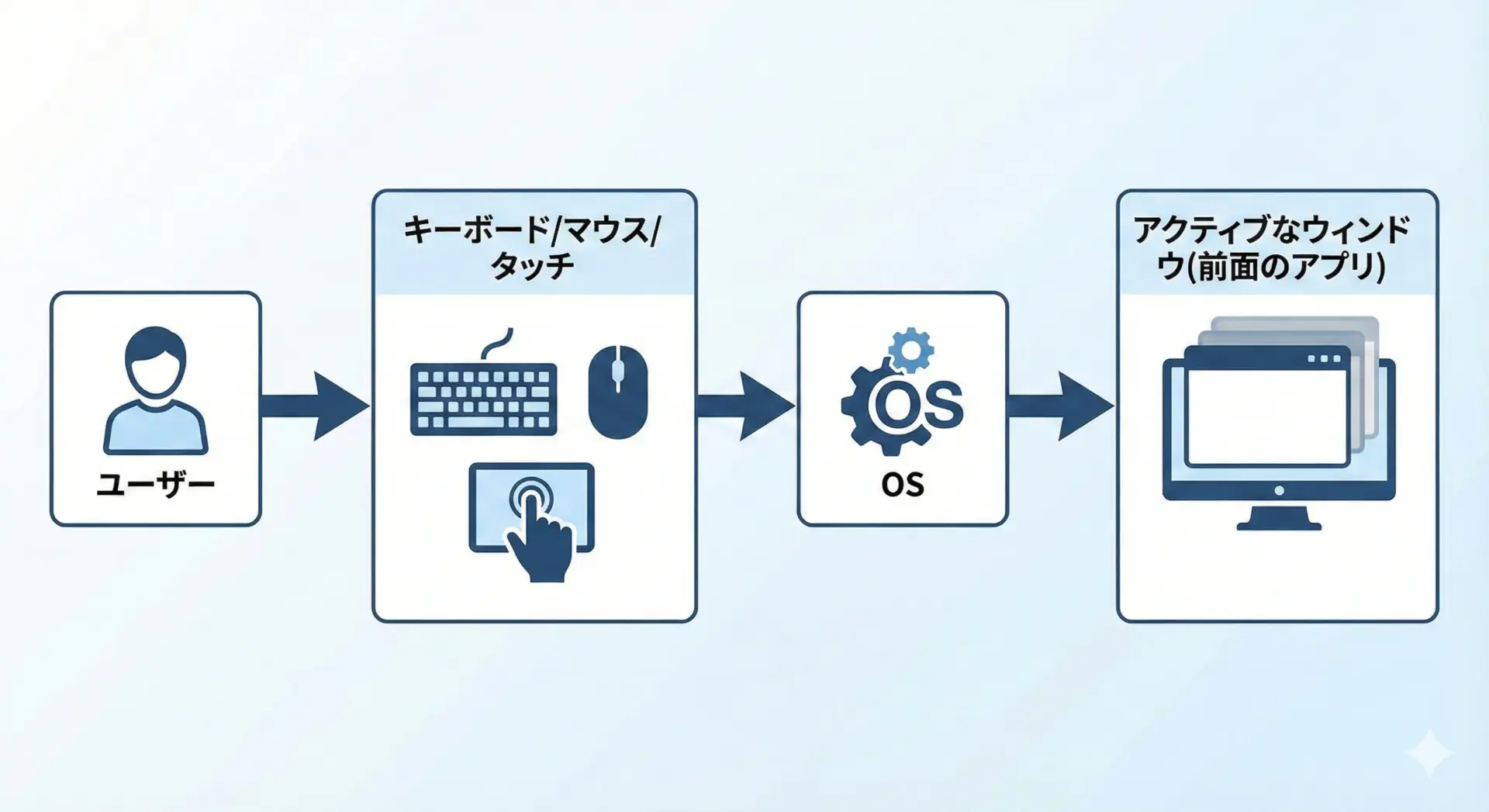 まずOSが受け取り、「どのアプリに渡すべき入力か?」を判断してから、対応するアプリに通知します。