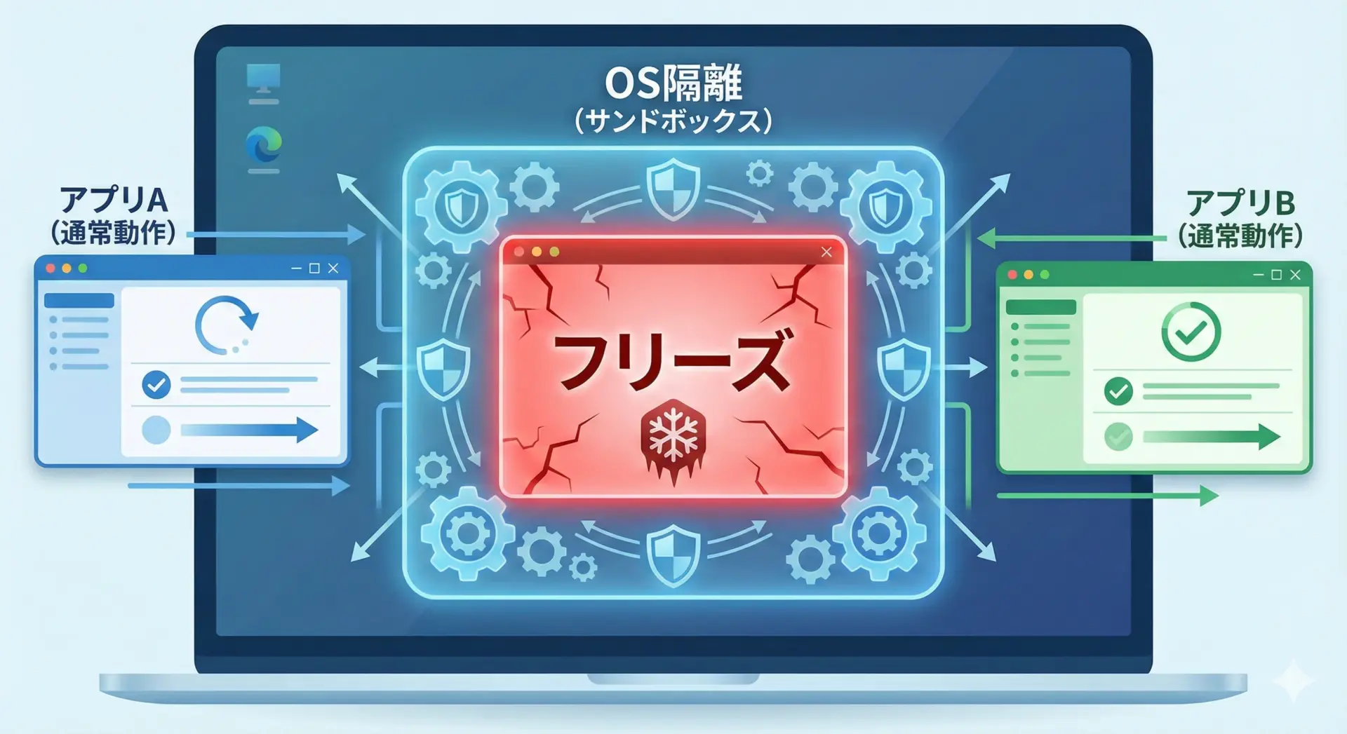 OSは、アプリ同士を適度に隔離し、問題が起きたときに「ここから先には広げない」という防波堤の役割を果たします。
