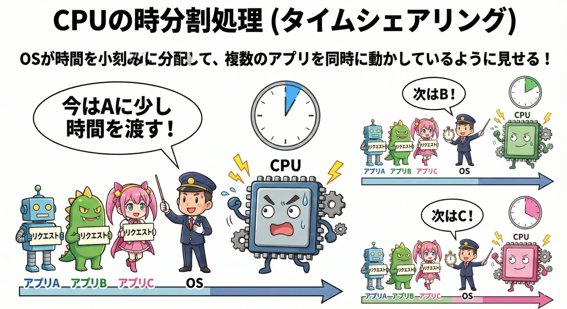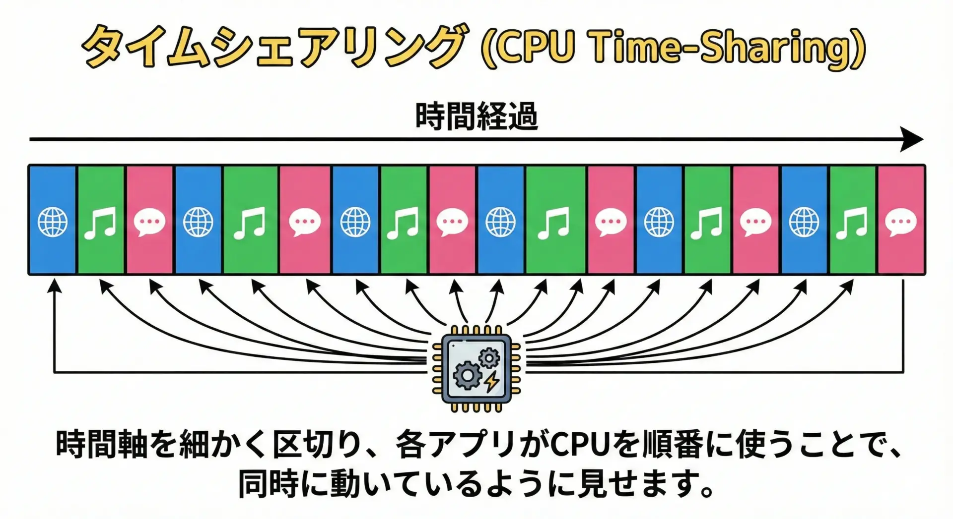 OSは、CPUの時間をとても細かい単位(ミリ秒よりもっと短いレベル)で区切り、アプリに順番に割り当てます。