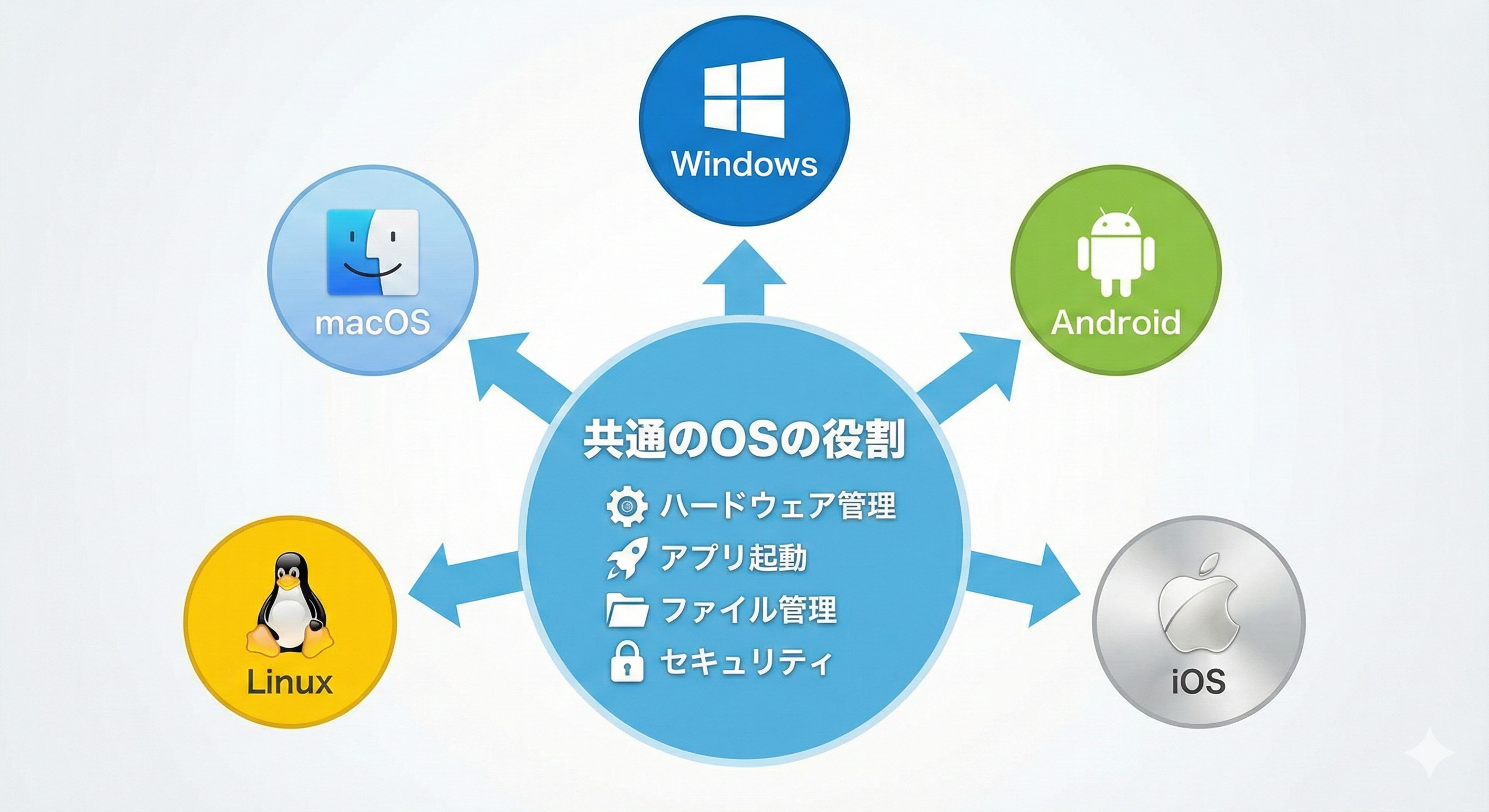 Windows、macOS、Linux、Android、iOSといったOSは、見た目や使い方は違っていても、「ハードウェアを管理し、アプリの土台となる」という共通の役割を持ちます。