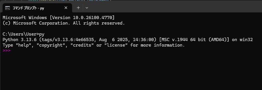 どのOSを使用していても、REPLを起動すると、以下のように入力部分に>>>が出現します。