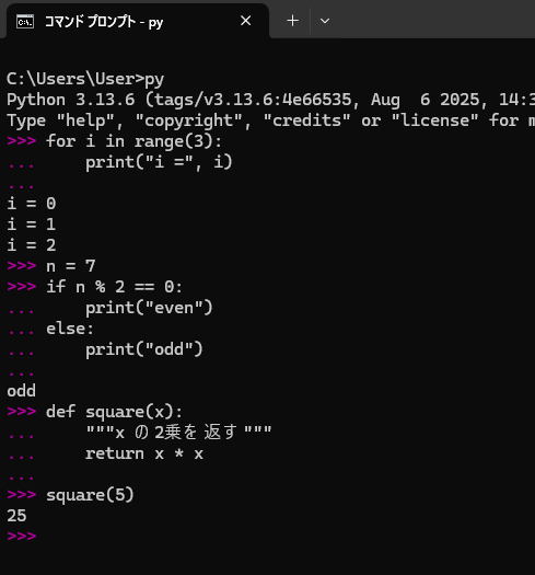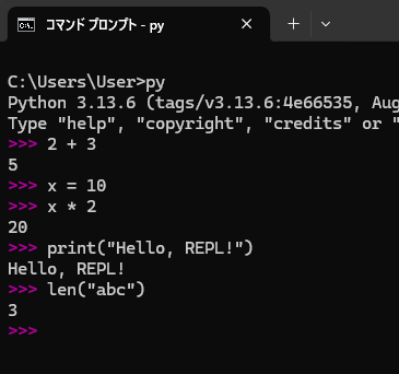 Pythonでは標準でこのREPL(対話モード)が利用でき、1行ずつコードを実行しながら挙動を確かめられます。
