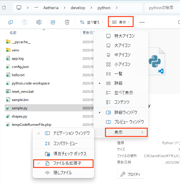 エクスプローラで「ファイル名拡張子」を表示にして、example.py.txt