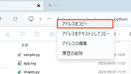 任意のフォルダパスを簡単に取得したい場合、まずエクスプローラーでpyファイルがあるフォルダを表示します。