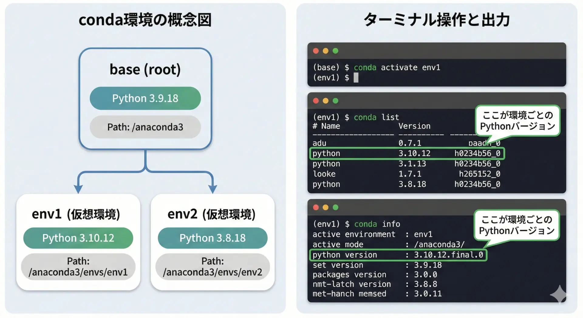 このコマンド単体ではPythonバージョンは直接表示されませんが、環境を1つずつ有効化してpython --versionを実行することで、環境名と特定のPythonバージョンを対応付けてメモすることができます。