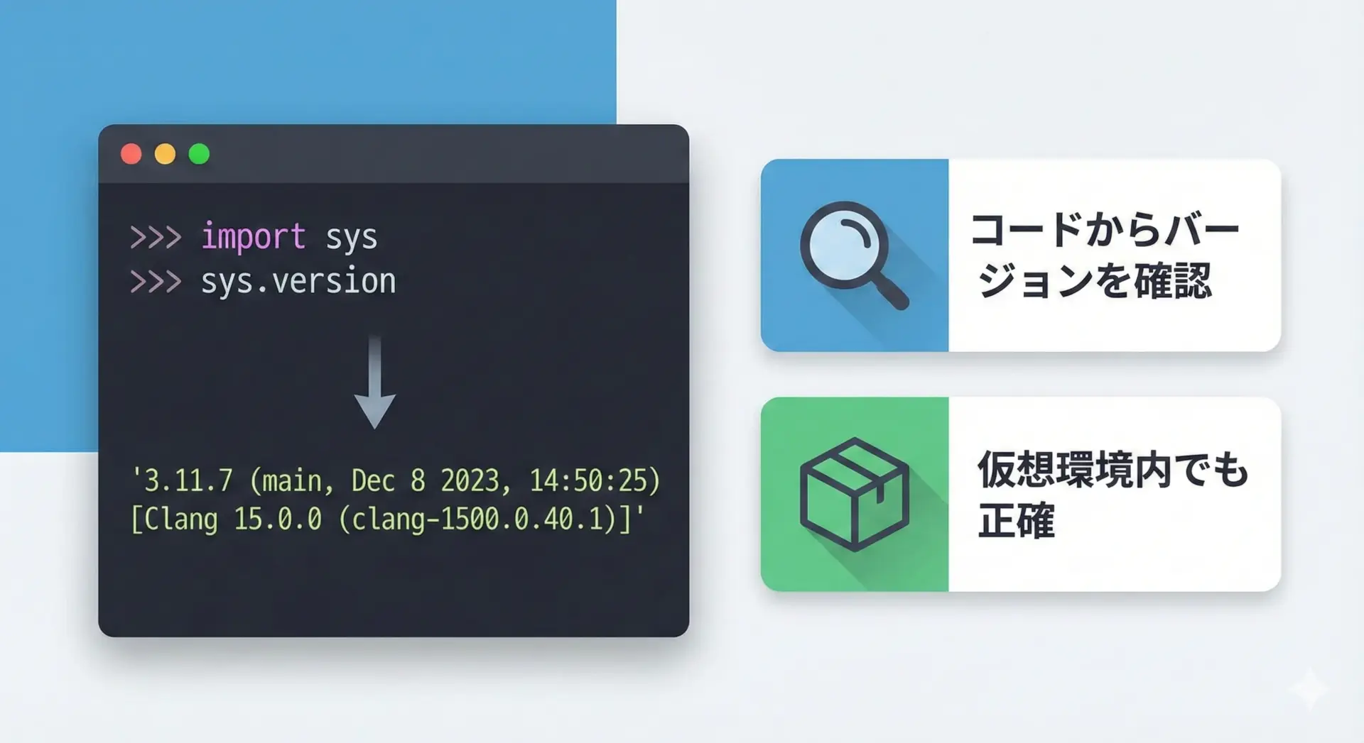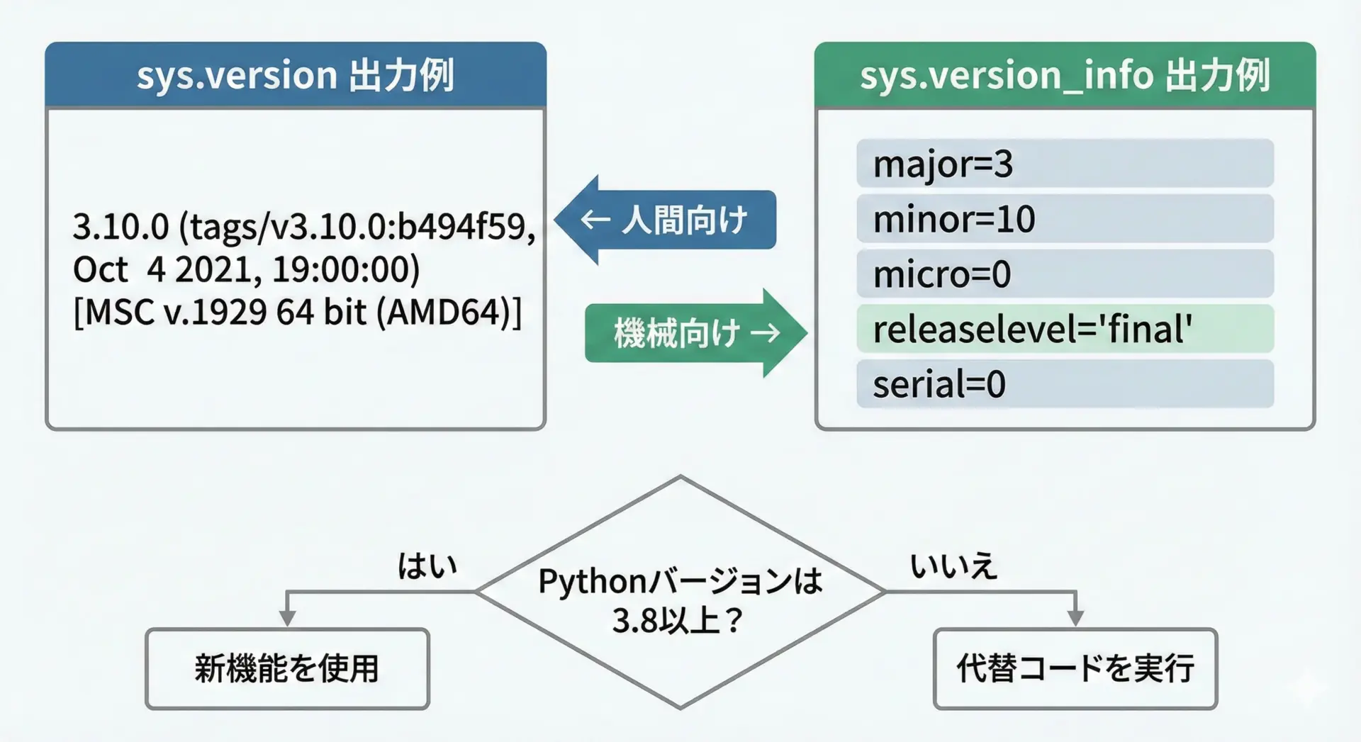 特に、コード内での条件分岐にはsys.version_infoを使うことで、確実かつ読みやすいバージョンチェックが可能です。