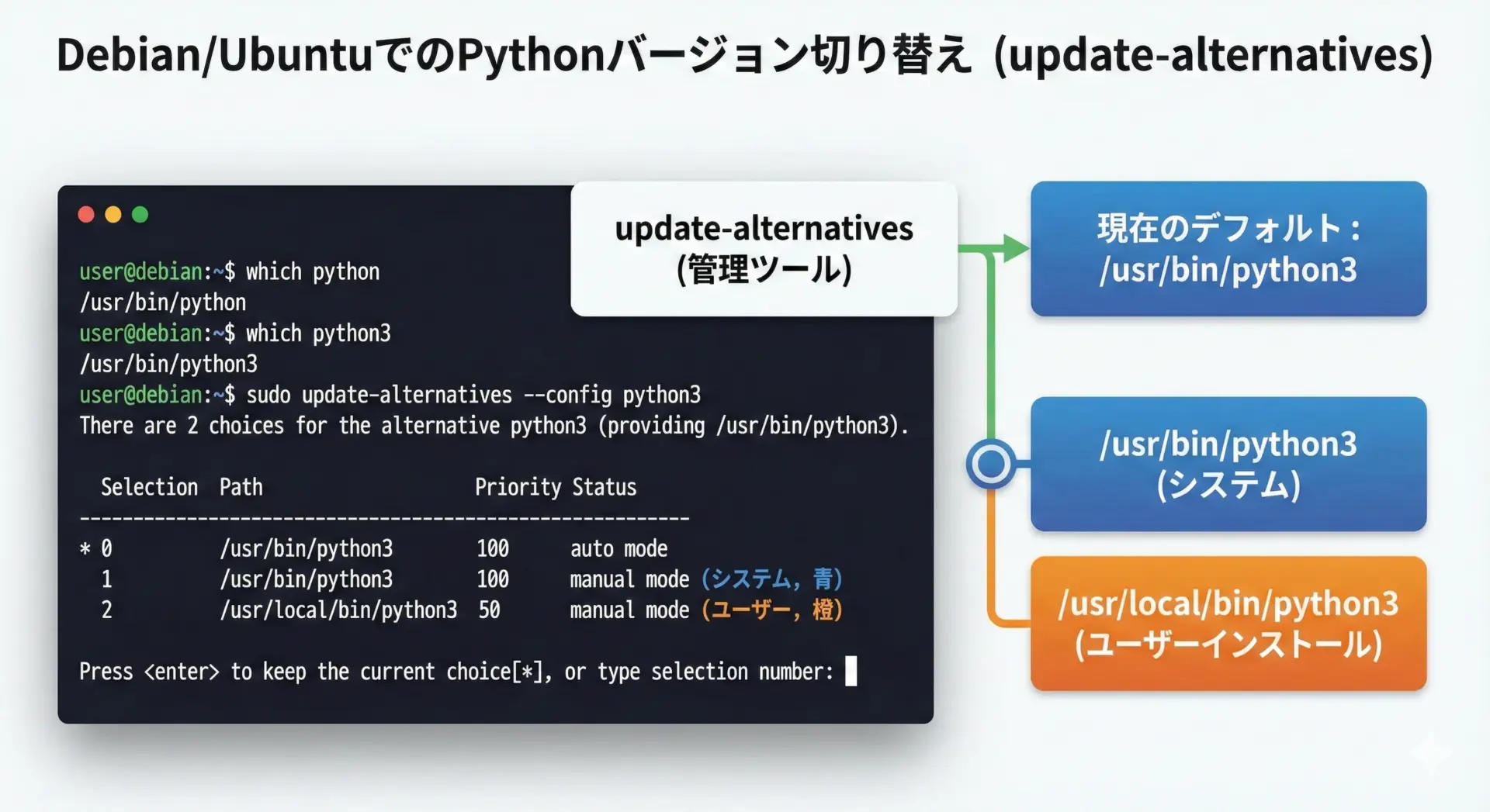 Linuxでは、ディストリビューションによってPythonの扱いが異なりますが、共通してwhichやupdate-alternativesを用いた確認が有効です。