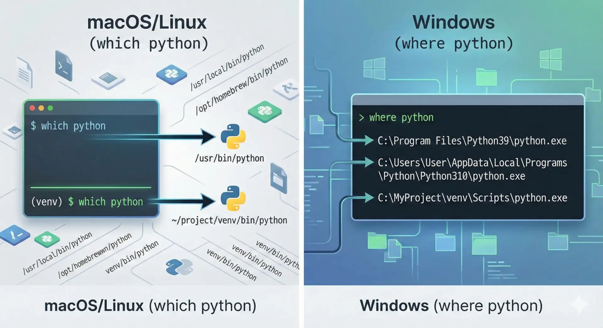 同じpythonという名前でも、OSやインストール方法によって実態が異なるため、ここを理解しておくとトラブルシューティングが楽になります。