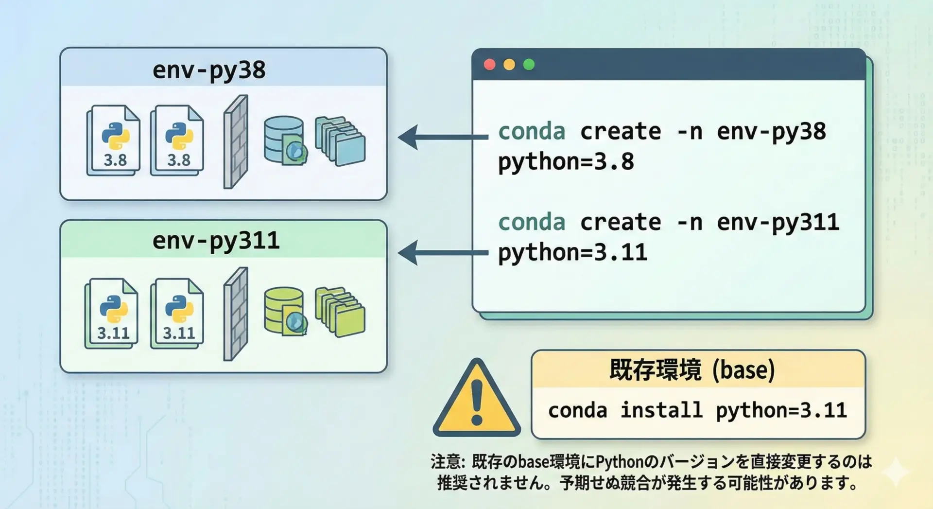 チーム開発などでは、「py38」「py311」のように環境名にバージョンを含める運用にしておくと、後から見てもわかりやすくなります。