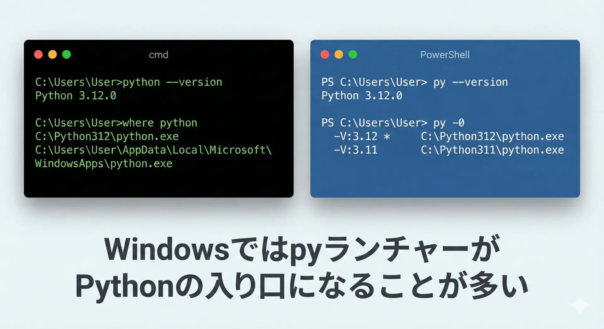 Windowsでは、pythonコマンドのほかにpyランチャーが存在するため、少し事情が複雑です。
