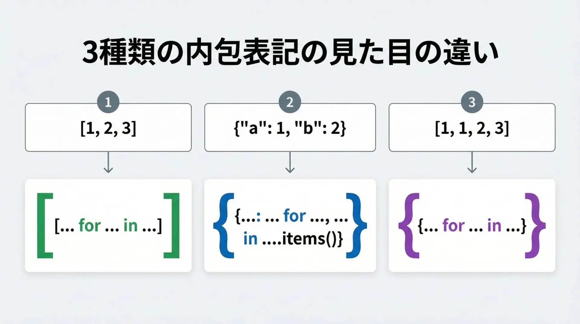 最初に押さえておきたいのは、3種類の内包表記の「かたち」の違いです。