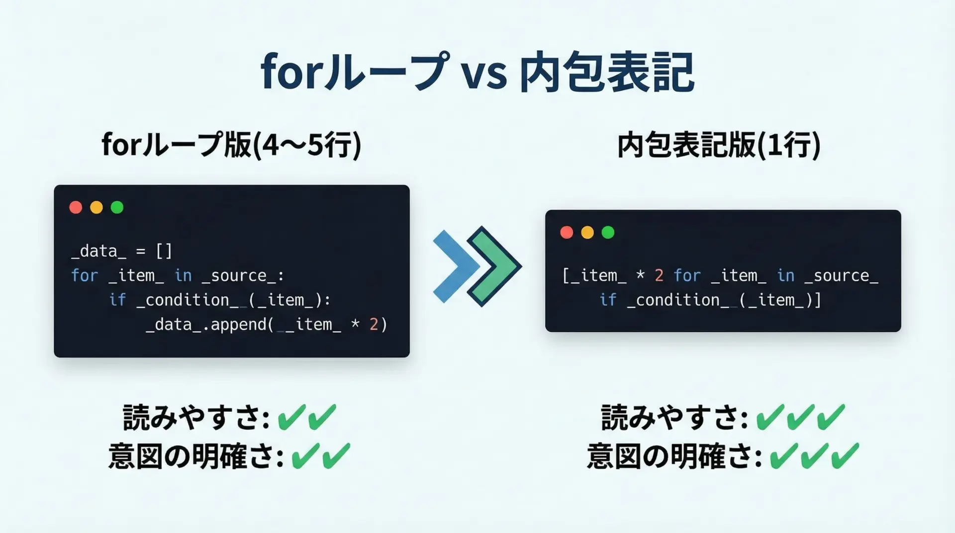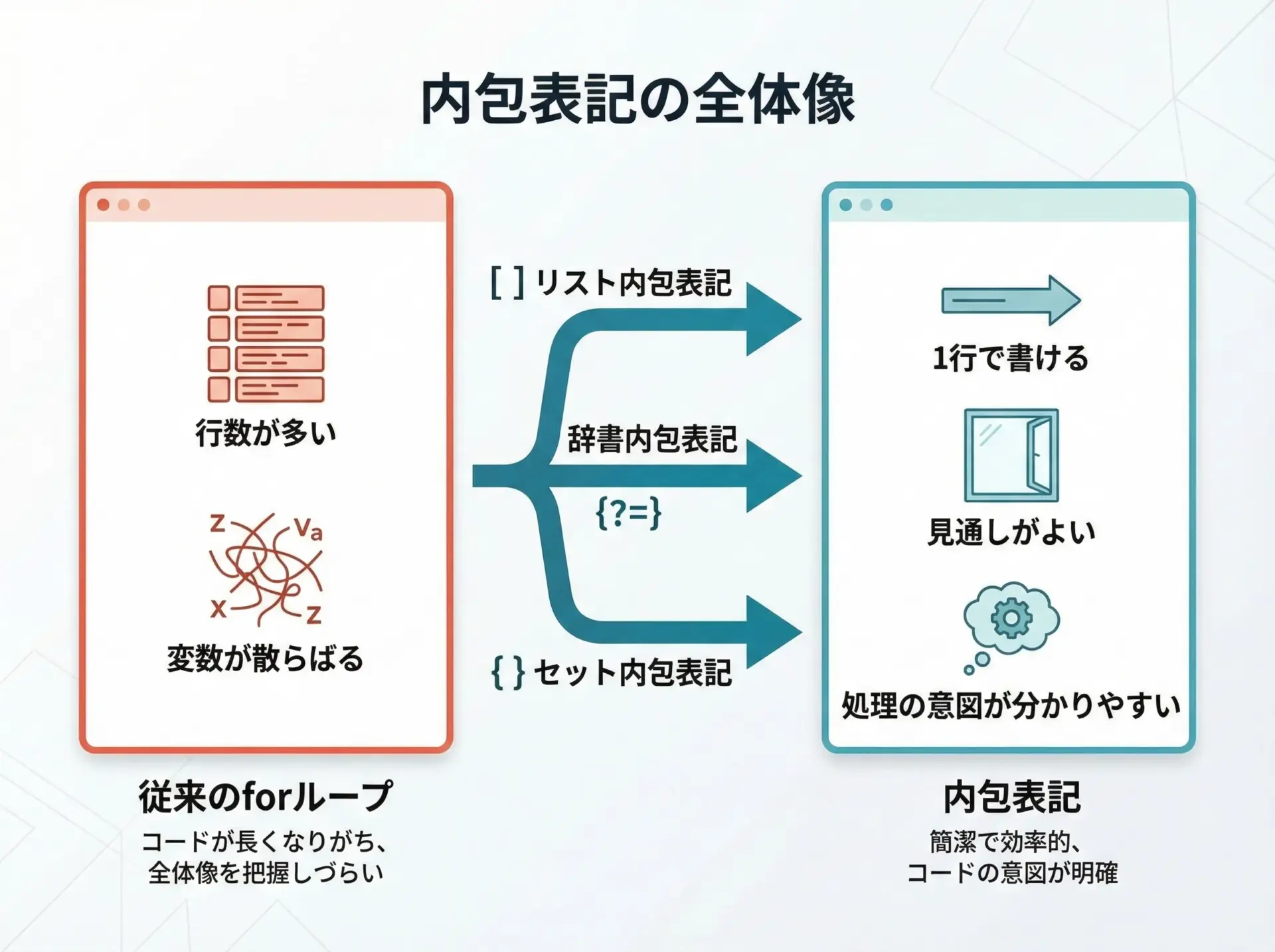短くできても、読みやすさが落ちるようなら内包表記にこだわらない方がよいですが、「こういうリスト(辞書・セット)が欲しい」という意図が1行で伝わるなら、内包表記は非常に有効です。