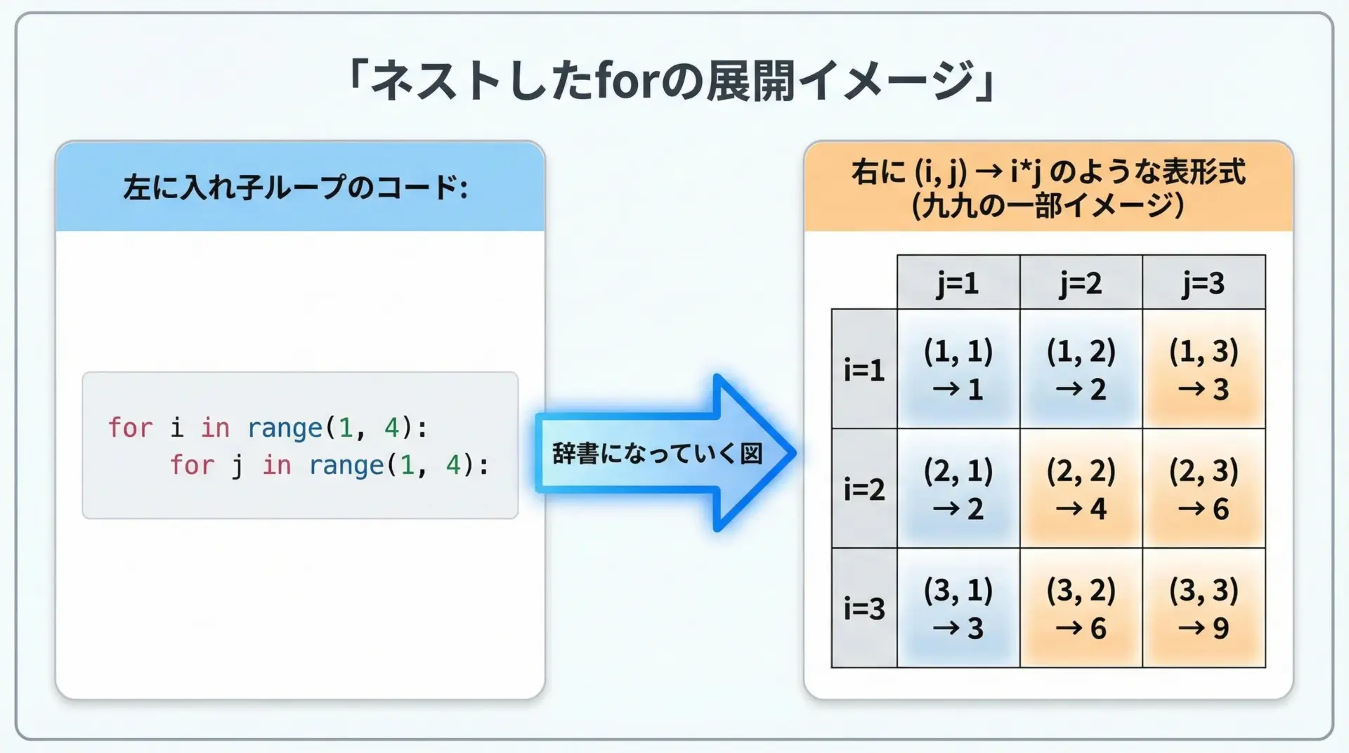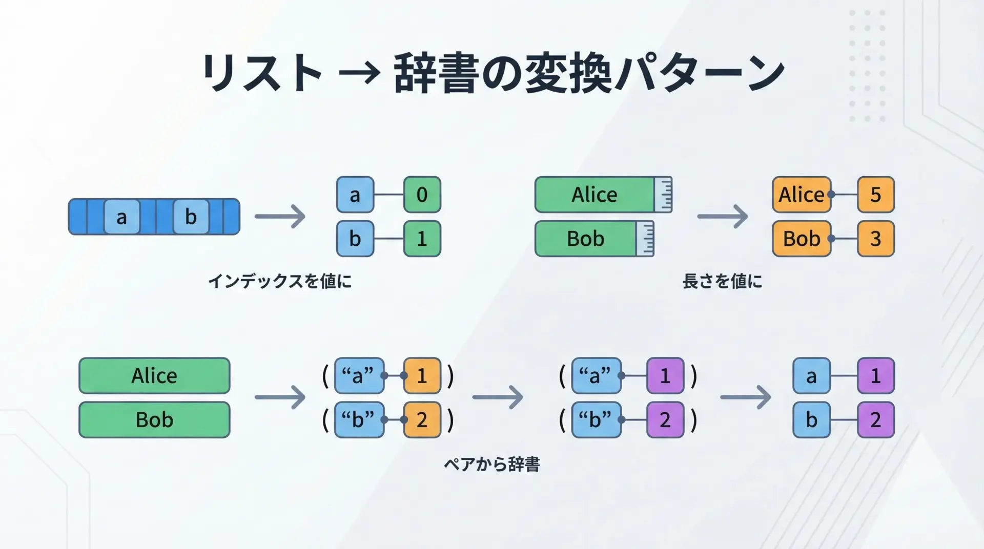 「どの値をキーにするか」「どの値を値にするか」を意識するのが、辞書内包表記を理解するコツです。