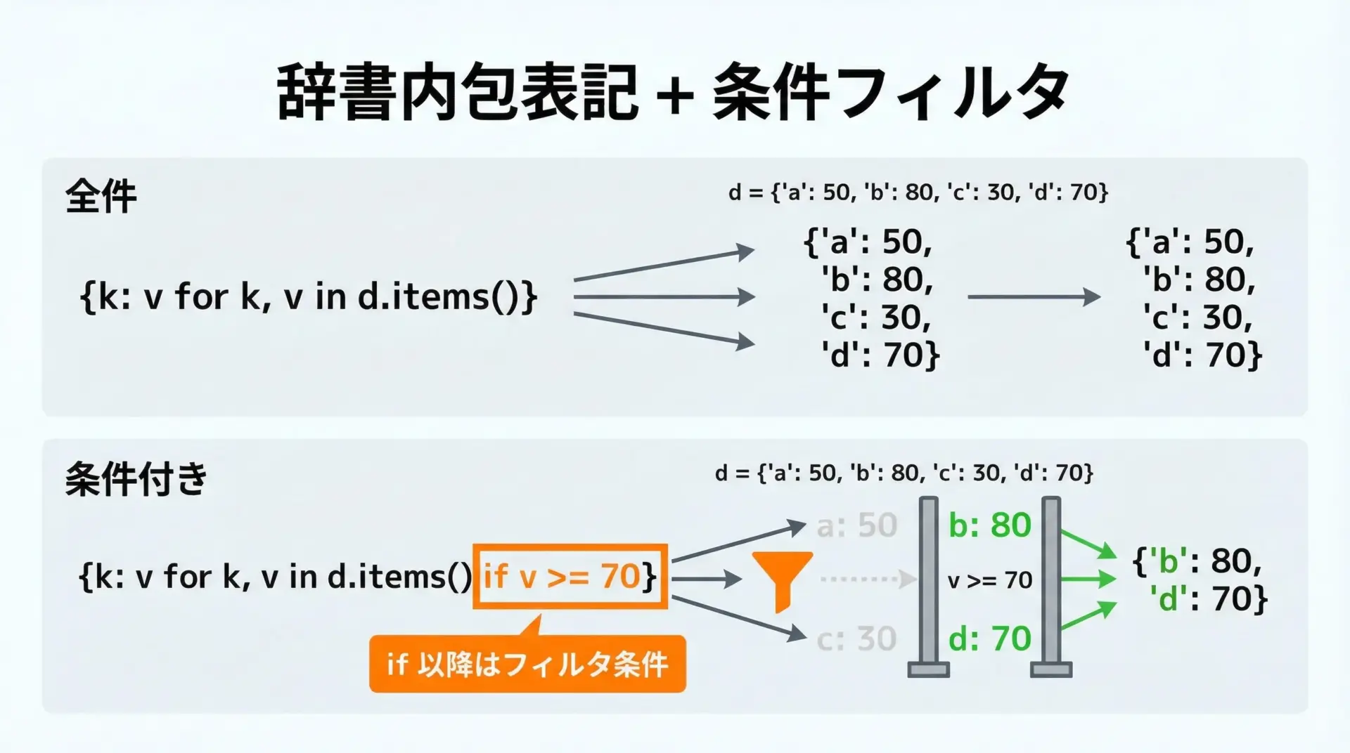 辞書内包表記では、末尾にif 条件を付けることで、要素をフィルタリングできます。
