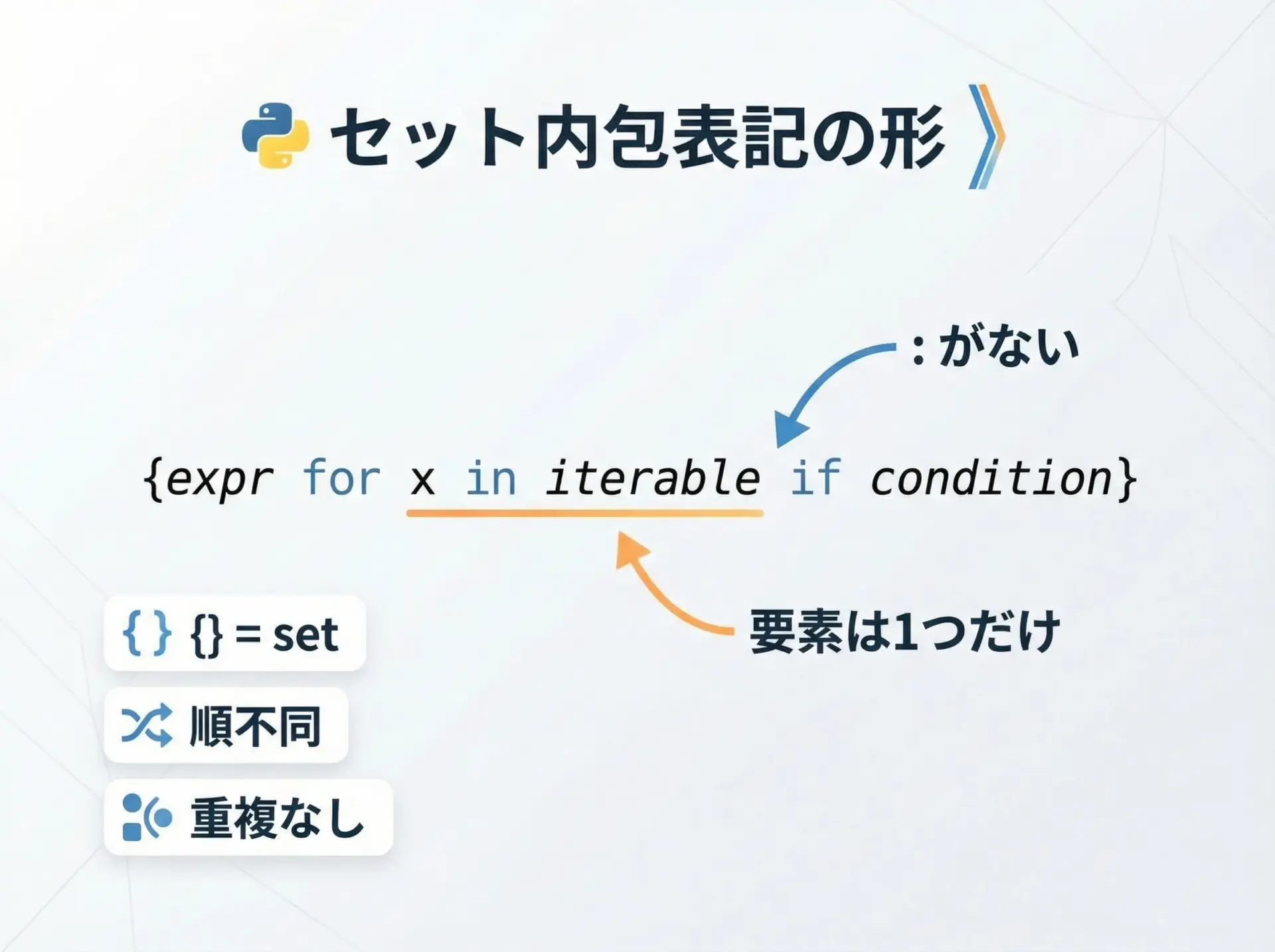 | セット内包表記 | {} | 値1つ | 重複なしの集合を作る |