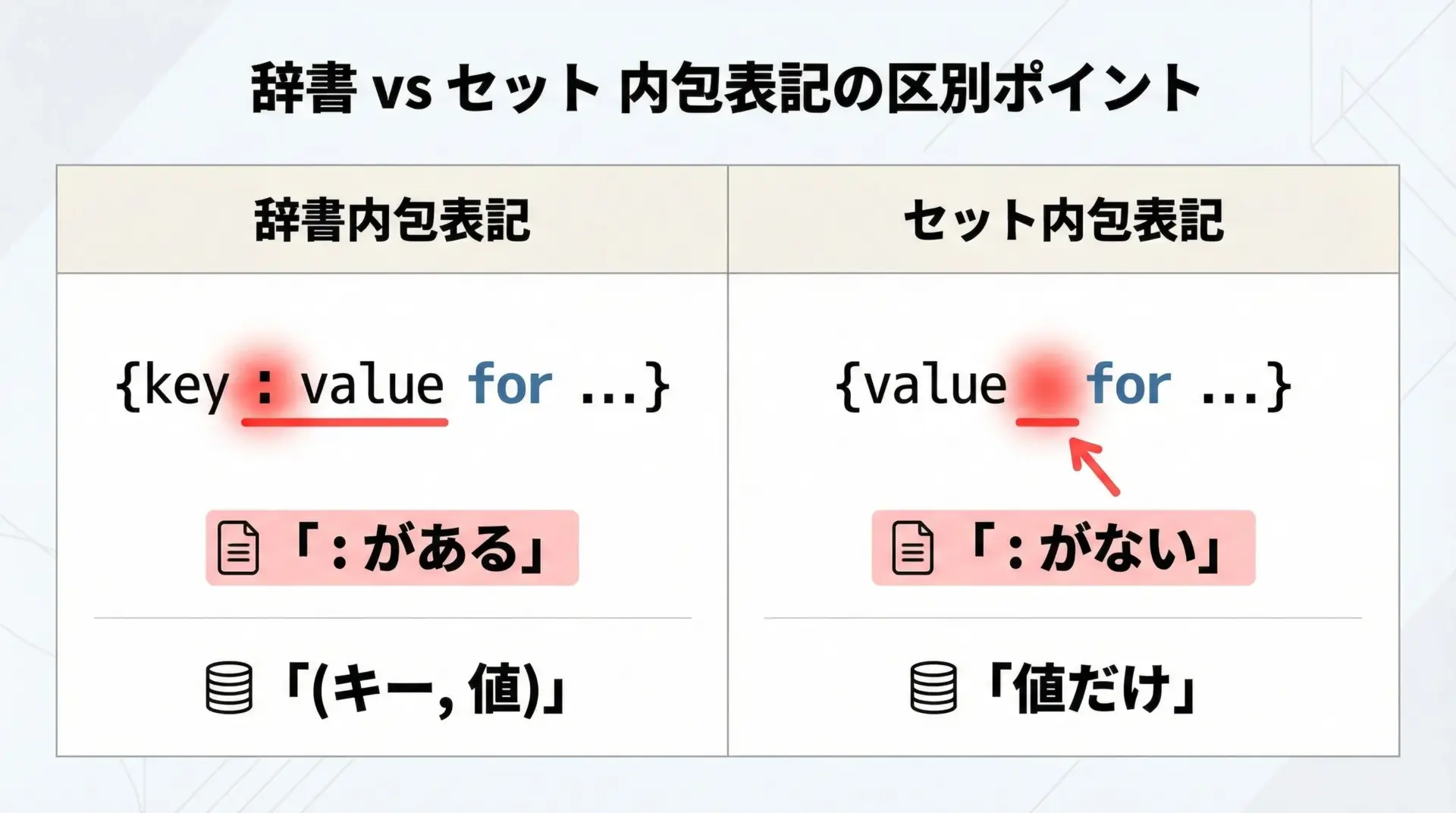 辞書内包表記とセット内包表記は、最初は記号が多くて戸惑いますが、「何をキーにするか(あるいは値だけなのか)」「コロン:があるかどうか」に注目すると、すっきり理解しやすくなります。