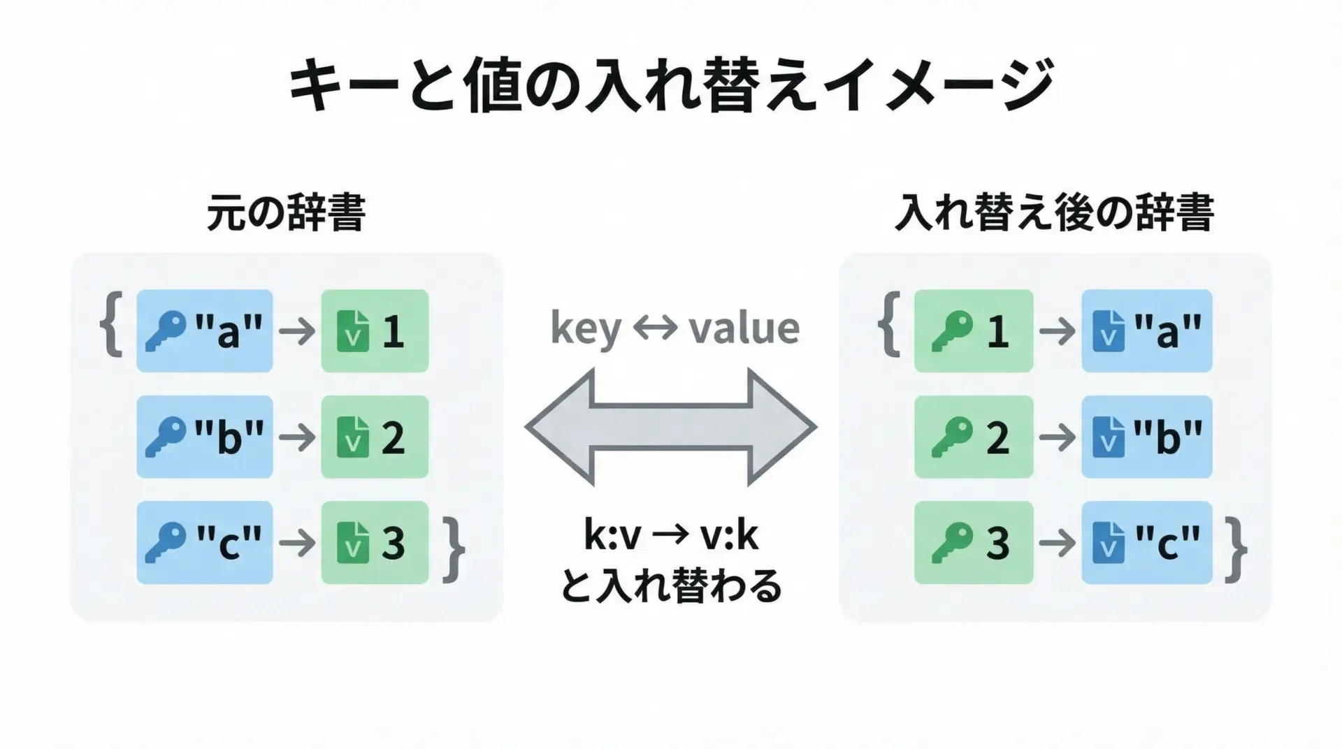 既存の辞書から、キーと値を入れ替えた新しい辞書を作るパターンはよく使われます。