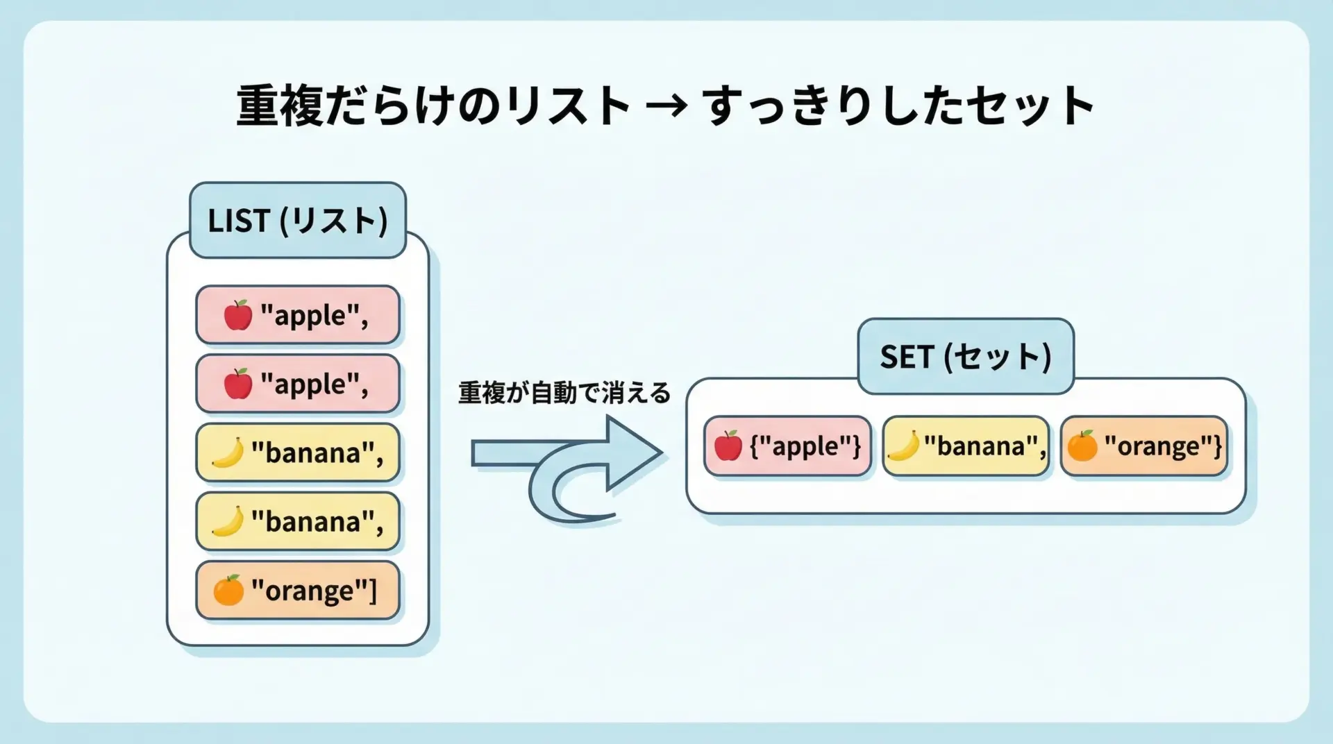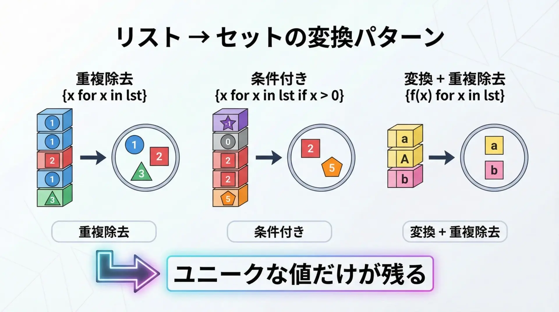 このように、「変換 → 重複除去」という流れを1行で書けるのが、セット内包表記の強みです。
