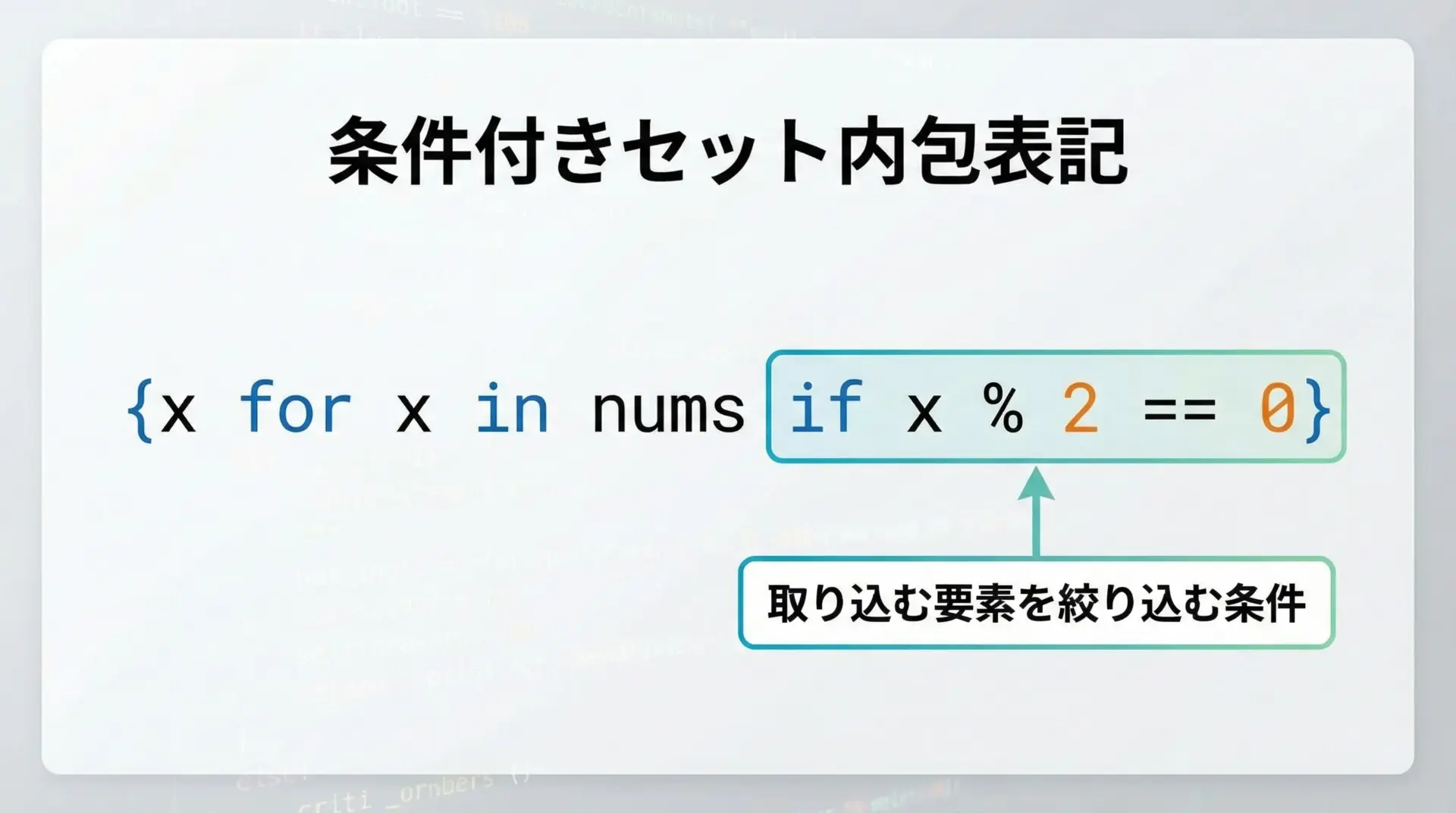 この役割だけならset(nums)でも同じですが、内包表記にすることで次のような「条件」や「変換」を同時に書けます。