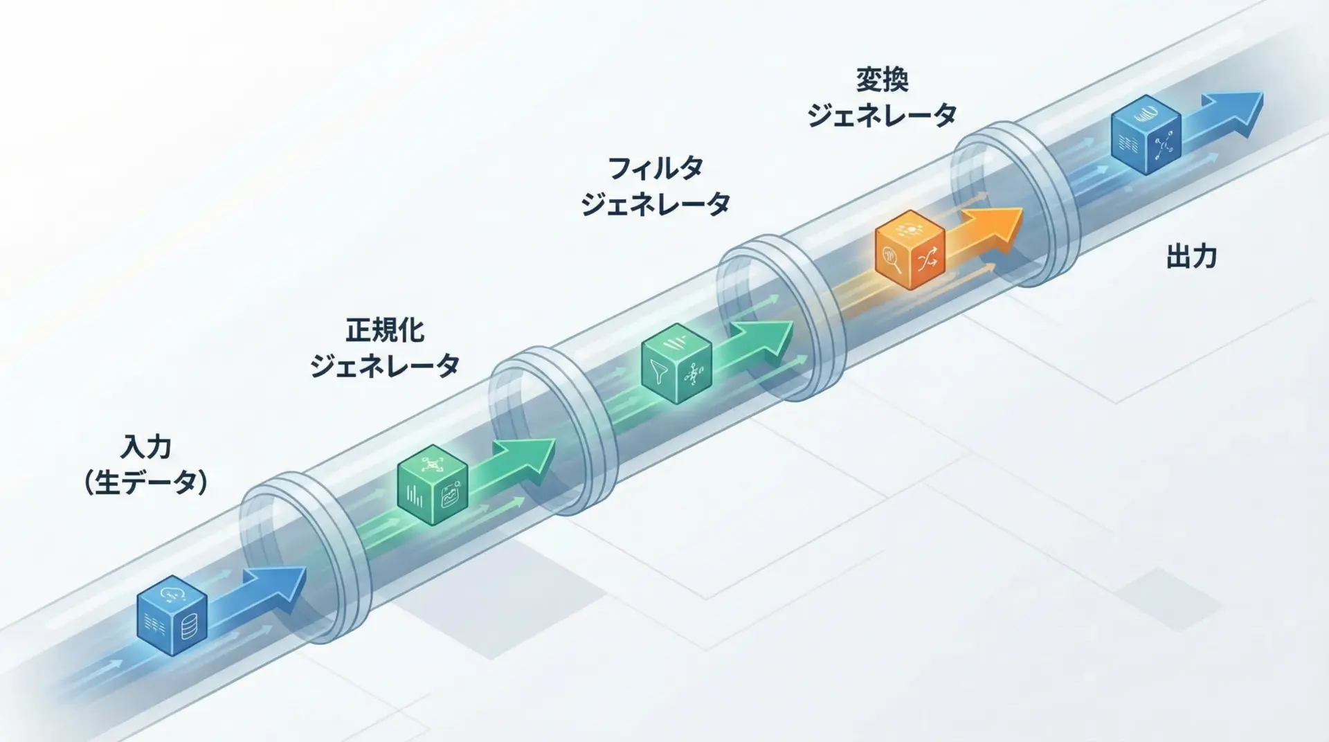 「読み込み」「フィルタリング」「変換」「集約」などのフェーズごとにジェネレータに切り出すと、テストしやすく、再利用も容易になります。