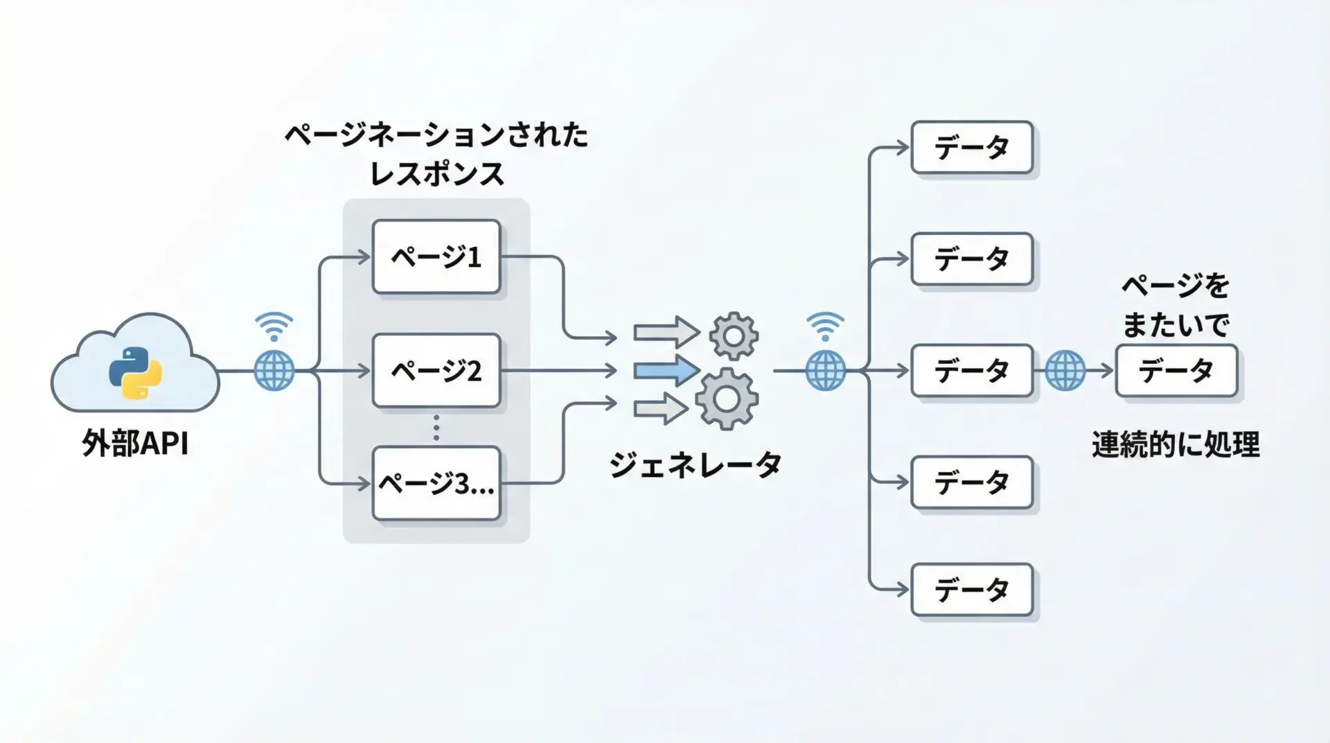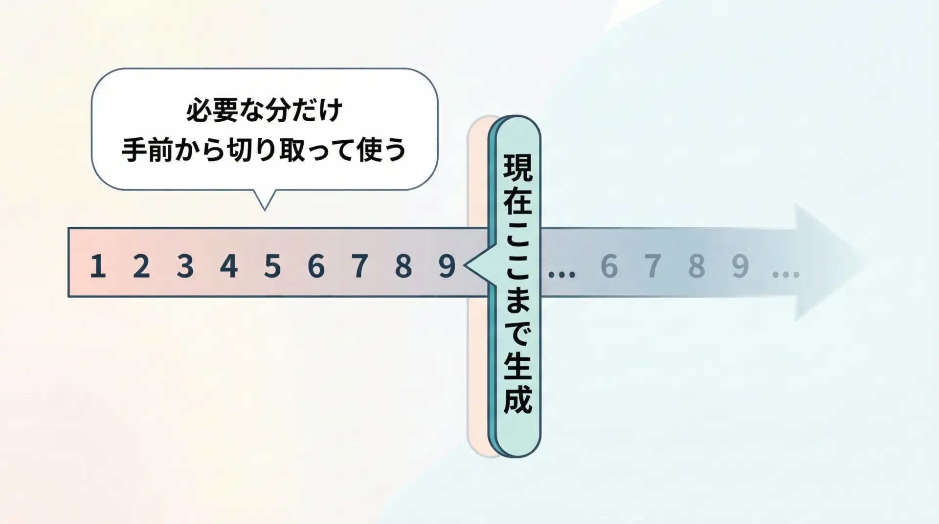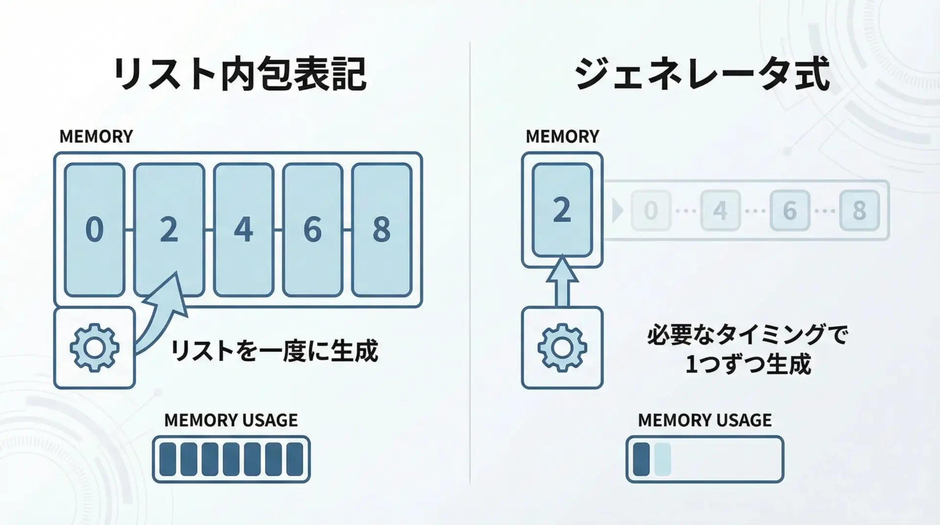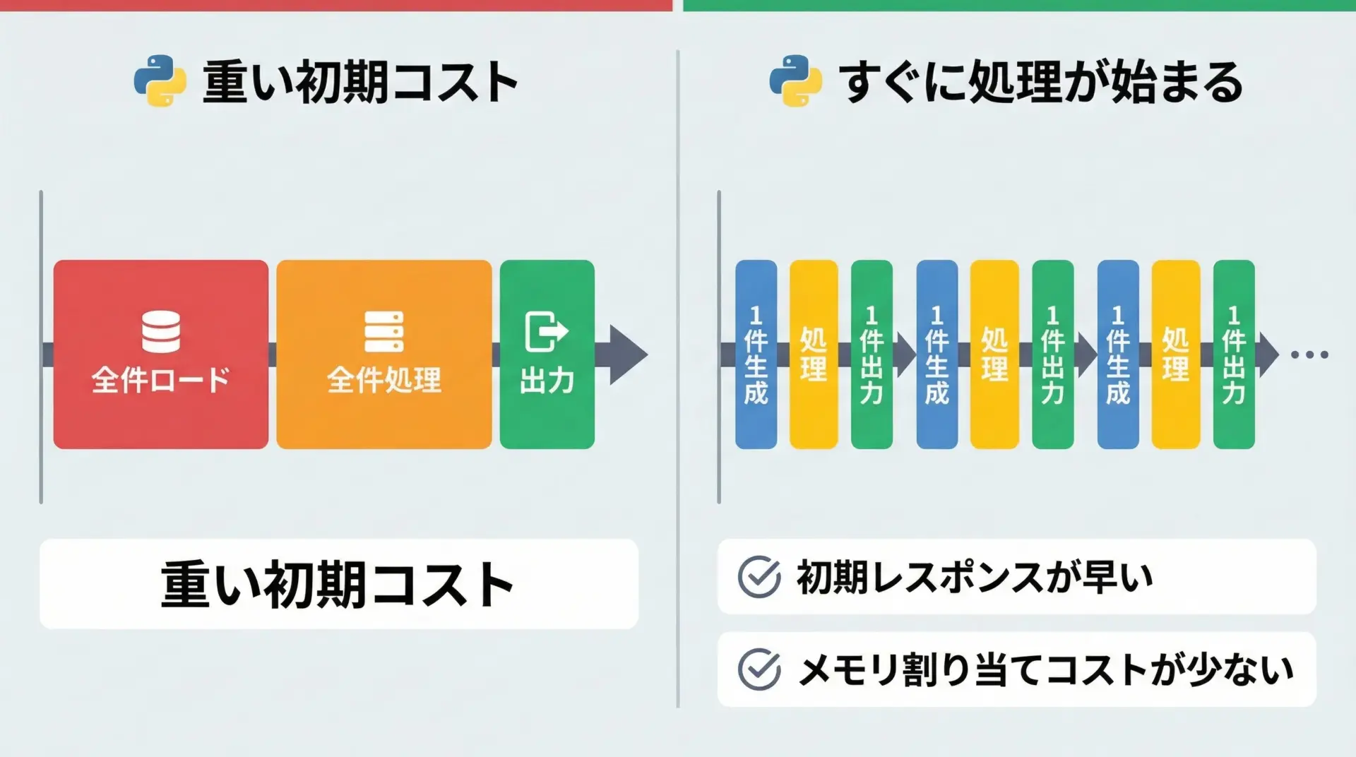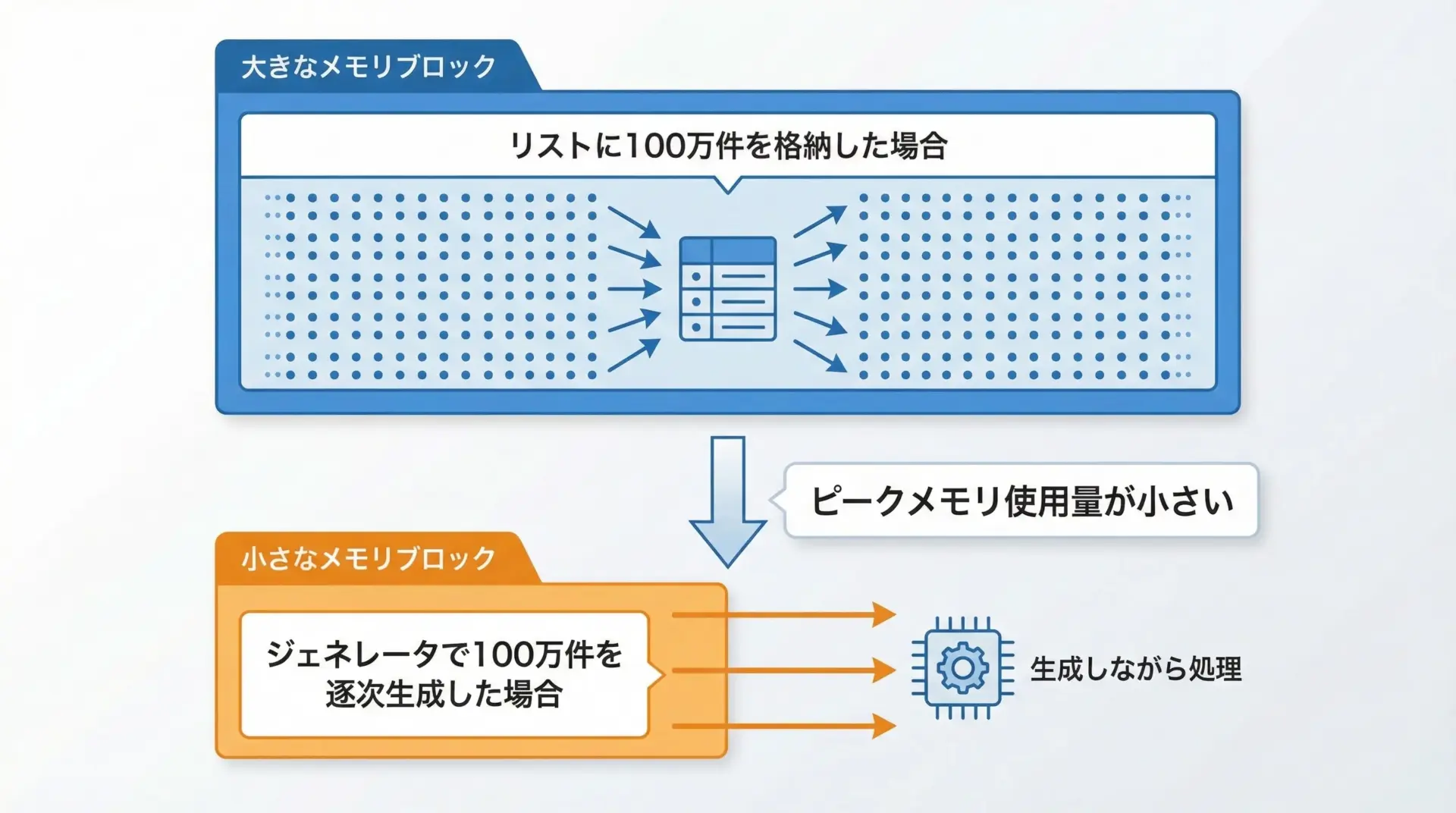 「全部まとめて処理する」のではなく「必要になった分だけ少しずつ処理する」イメージを持つと、ジェネレータの使い所が見えやすくなります。