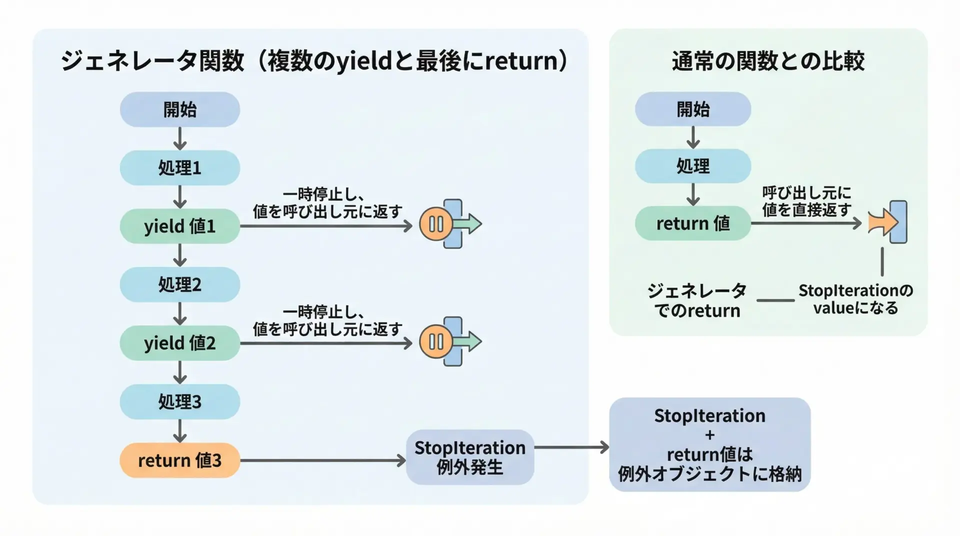 そのため、「ジェネレータで複数の値を返したいときはyield、処理の終了だけを示したいときはreturn」という役割分担で覚えておくとよいです。