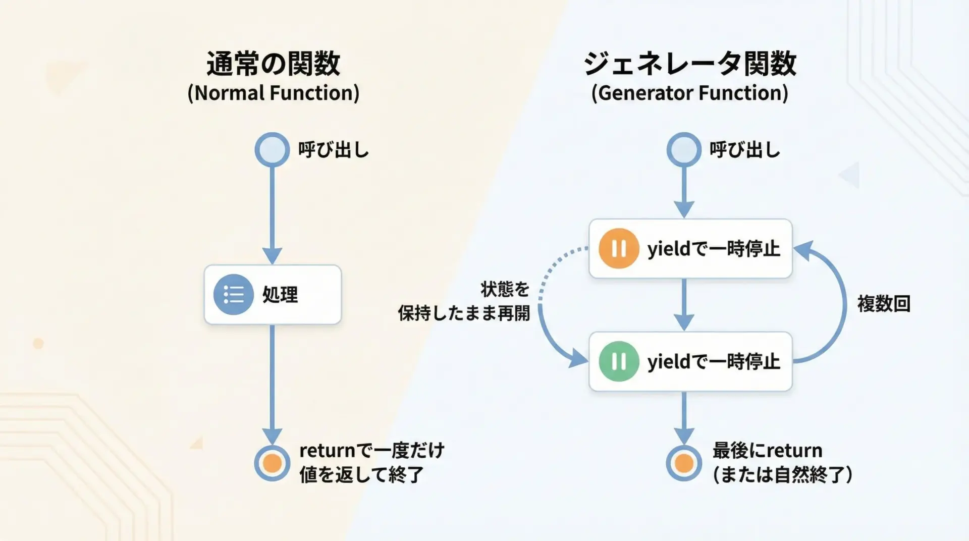 通常の関数とジェネレータ関数の最大の違いは、「いつ・何回、値を返すか」にあります。