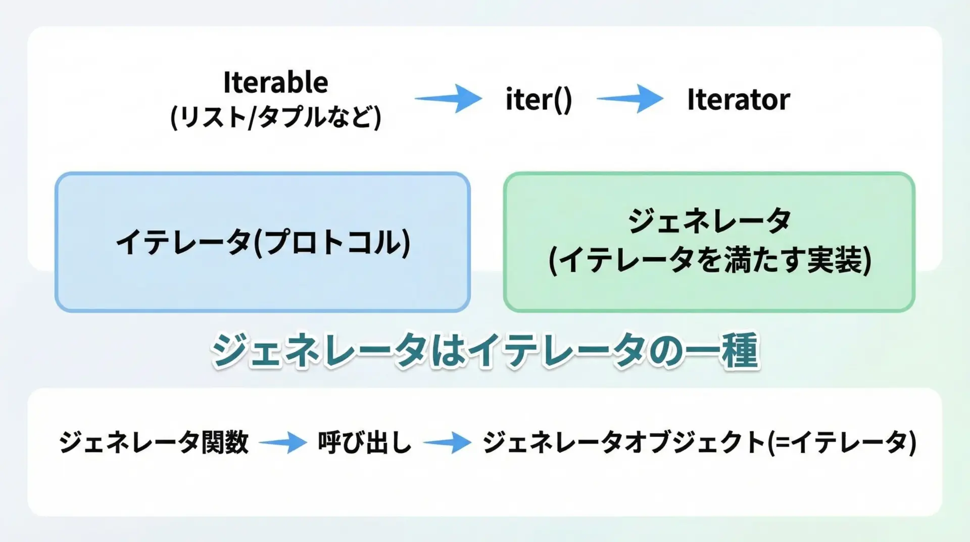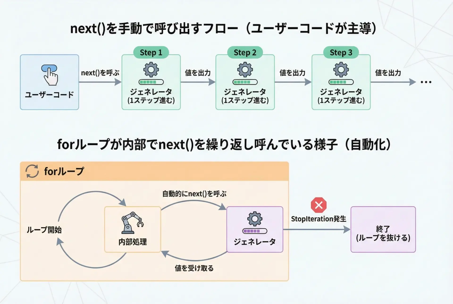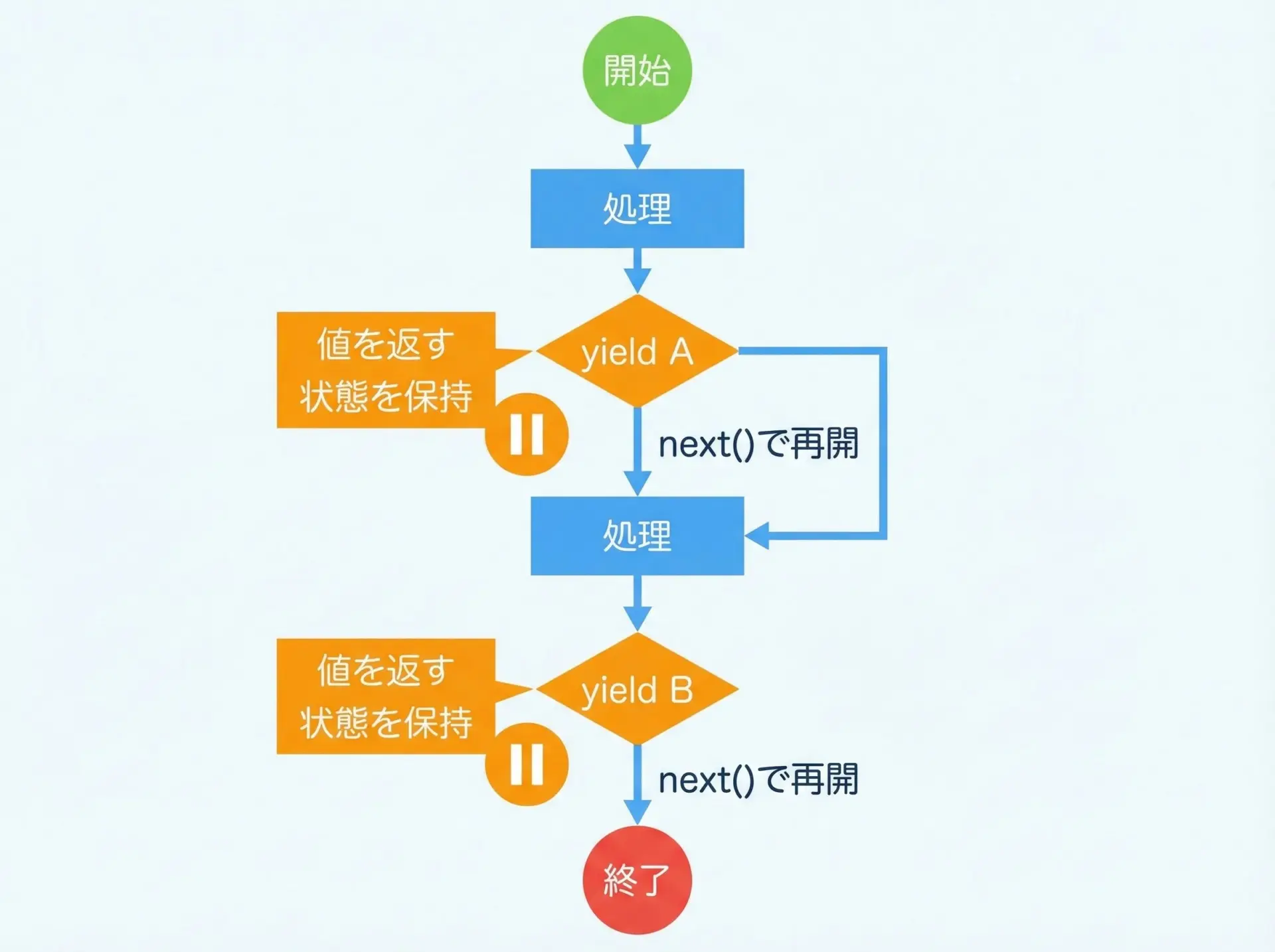 この仕組みを理解しておくと、ジェネレータのデバッグやカスタムイテレータの実装がしやすくなります。