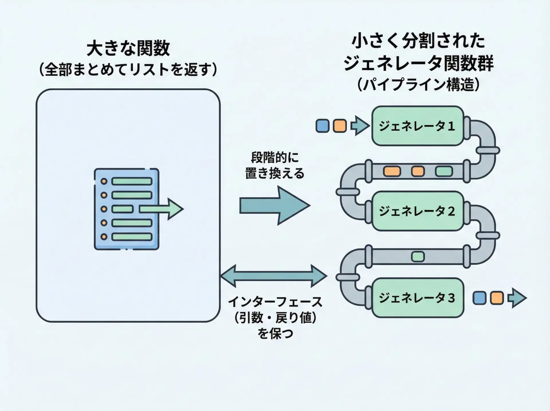 既存コードをジェネレータにリファクタリングする際は、次のようなステップを意識するとスムーズです。