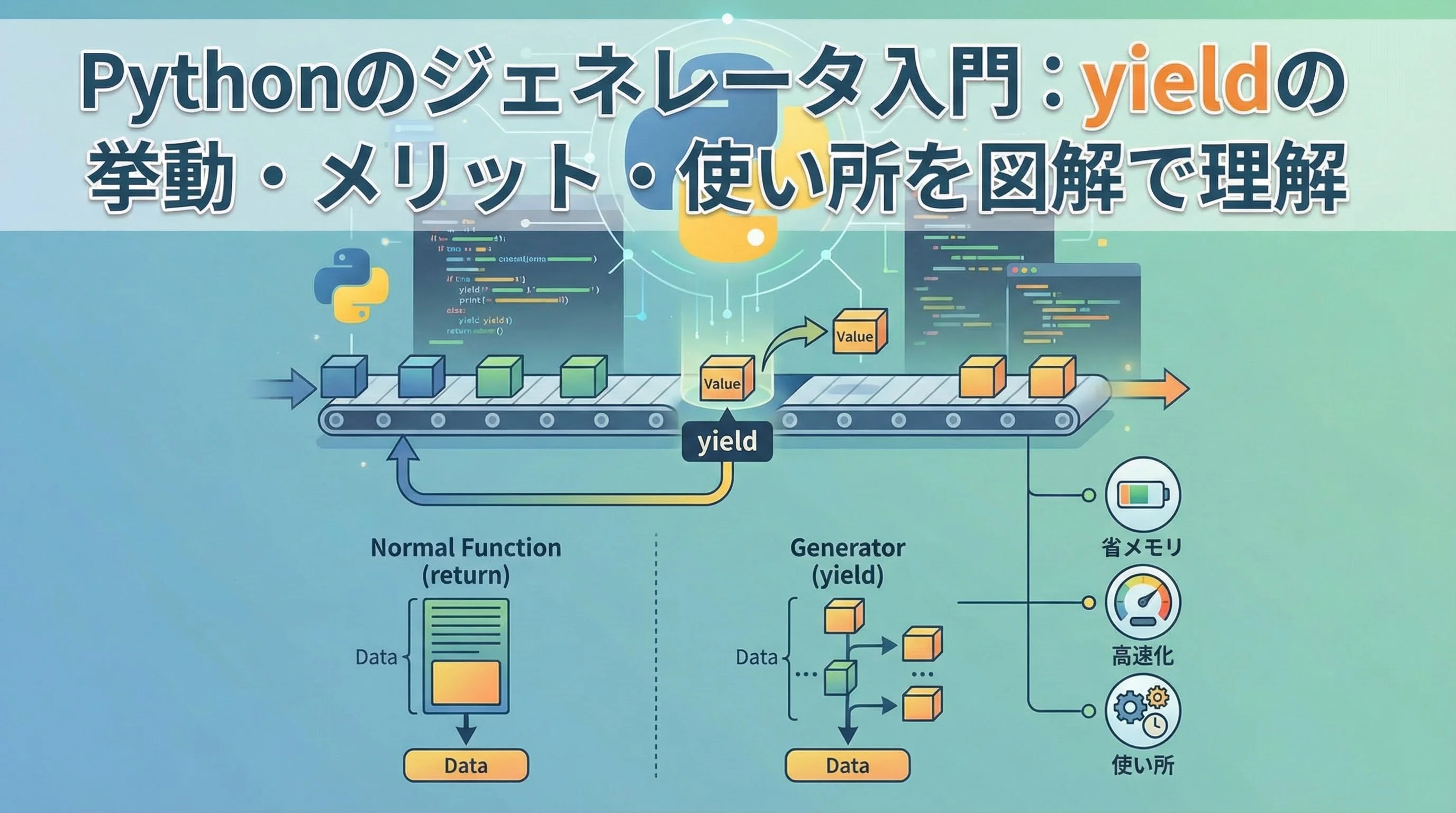 Pythonのジェネレータは、「必要なときに、必要な分だけ値を生成する」仕組みとして、メモリ効率とコードの柔軟性を大きく高めてくれます。