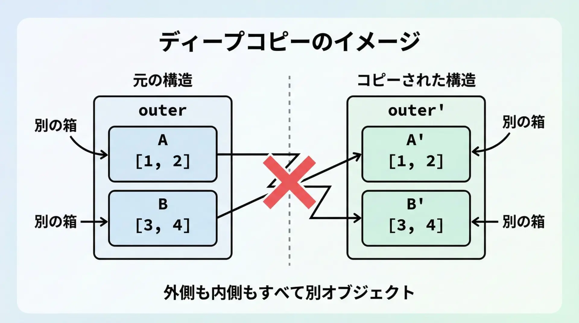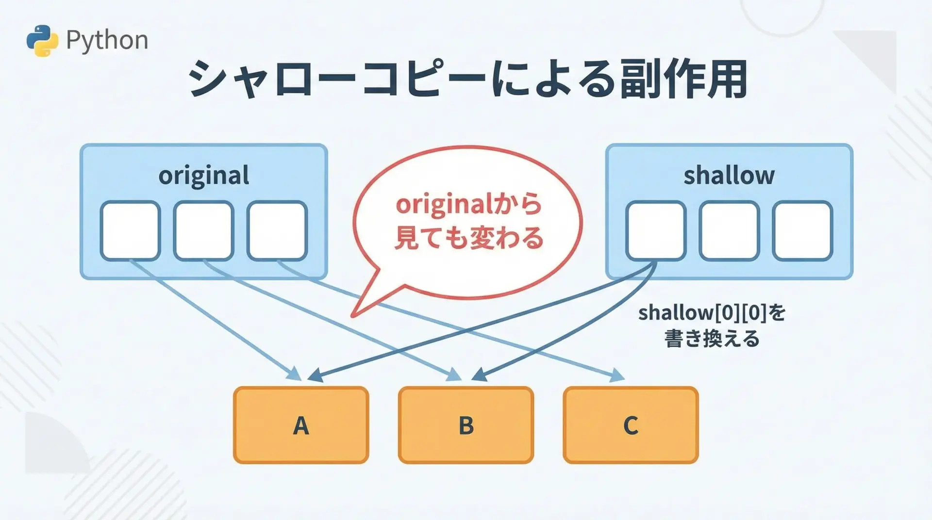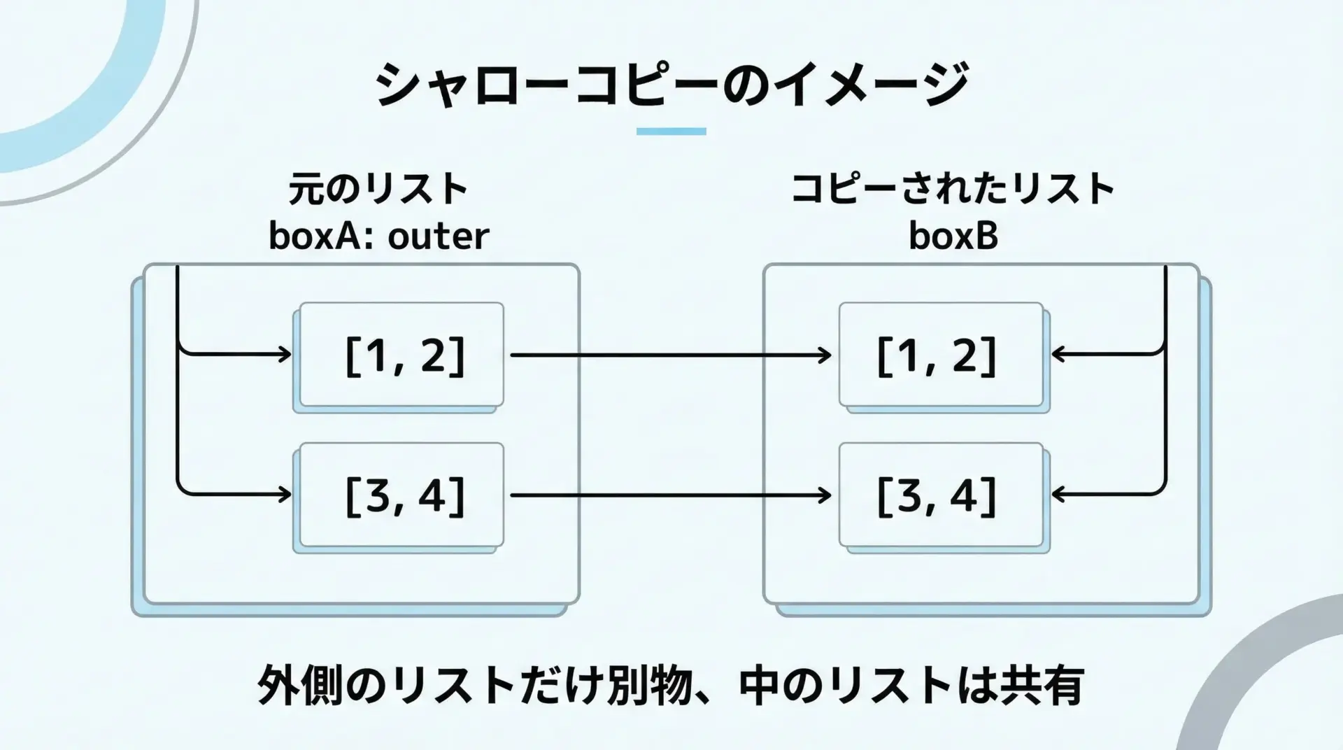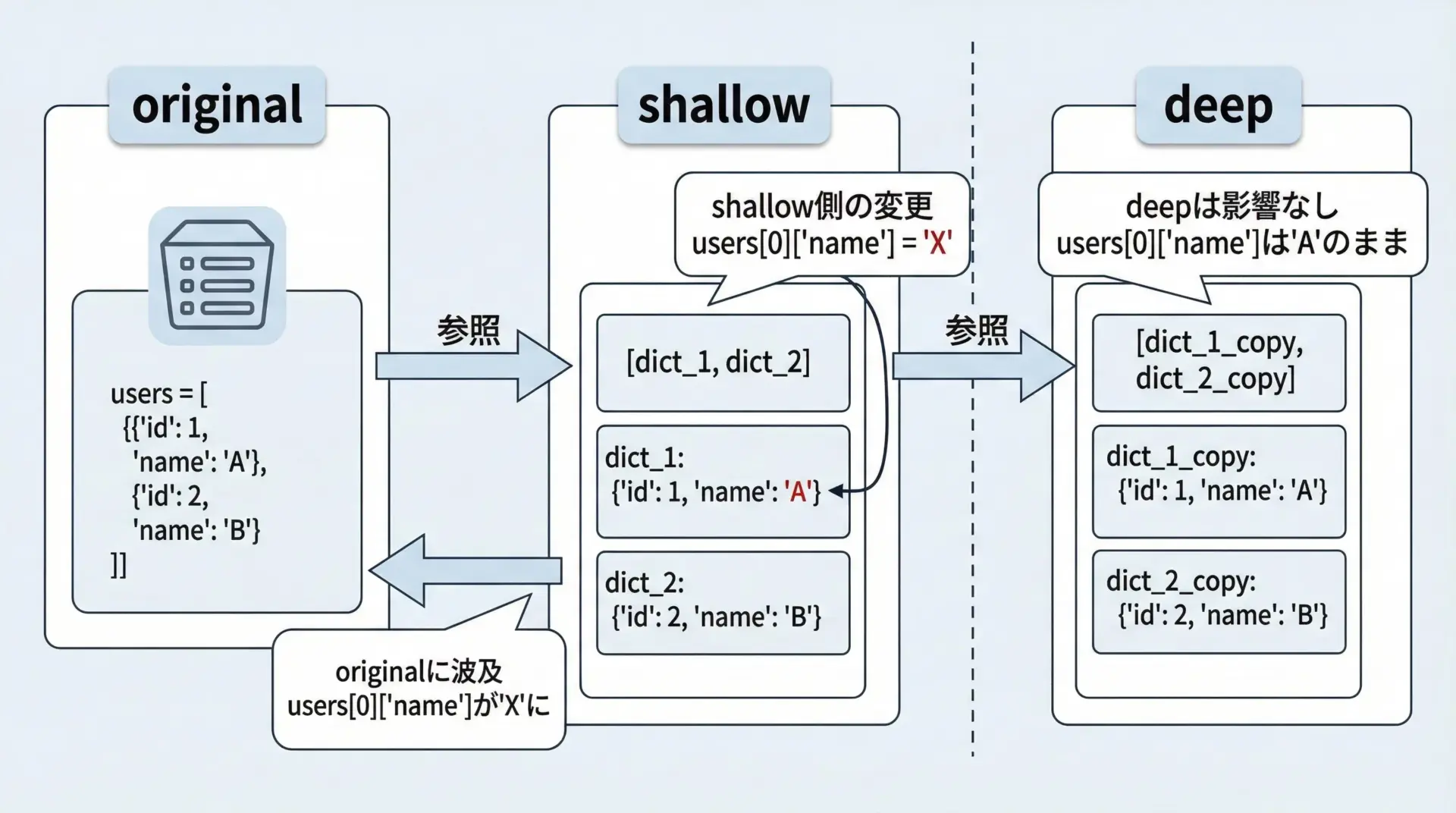 特にlistとdictは、ネスト(入れ子)されて使われることが多いため、シャローコピーとディープコピーの差が大きく現れます。