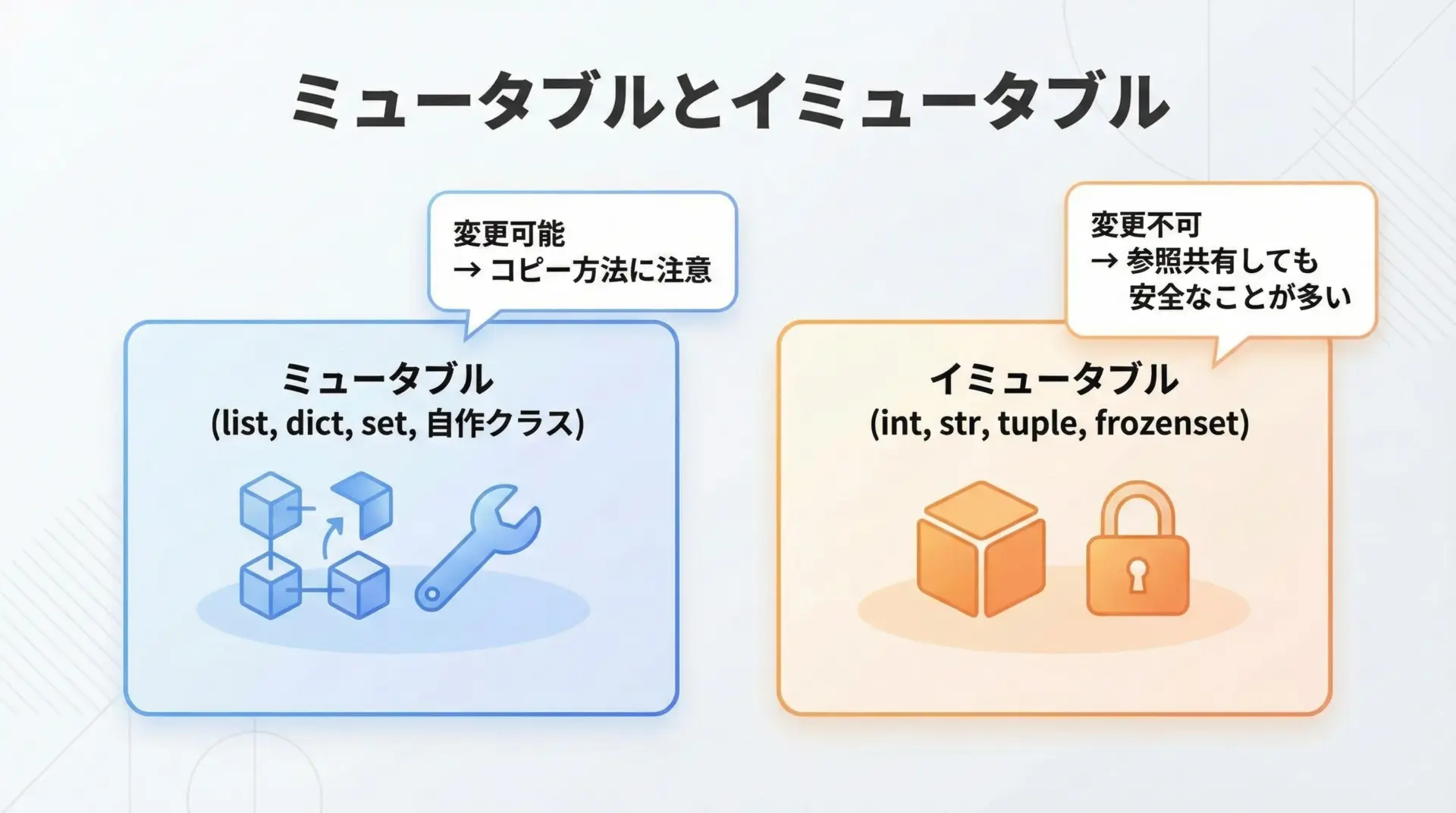 1. 可能であればtupleやfrozensetを活用し、「そもそも変更できない」構造を使うとトラブルが減ります。