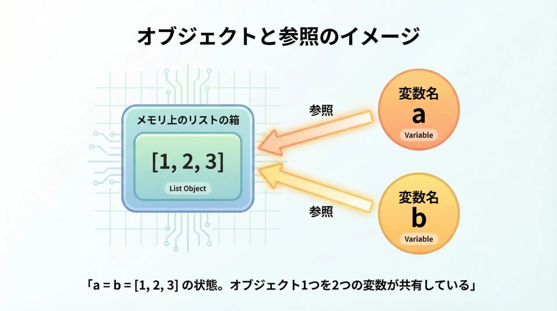 Pythonでは、値そのものを変数が直接持つのではなく、オブジェクト(実体)と、それを指し示す参照(アドレスのようなもの)に分かれて管理されています。