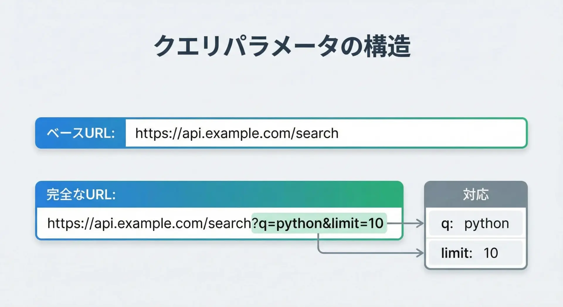 Web APIでは、URLに追加の情報(クエリパラメータ)を付けて送信したり、HTTPヘッダーで認証トークンなどを渡したりする必要があります。