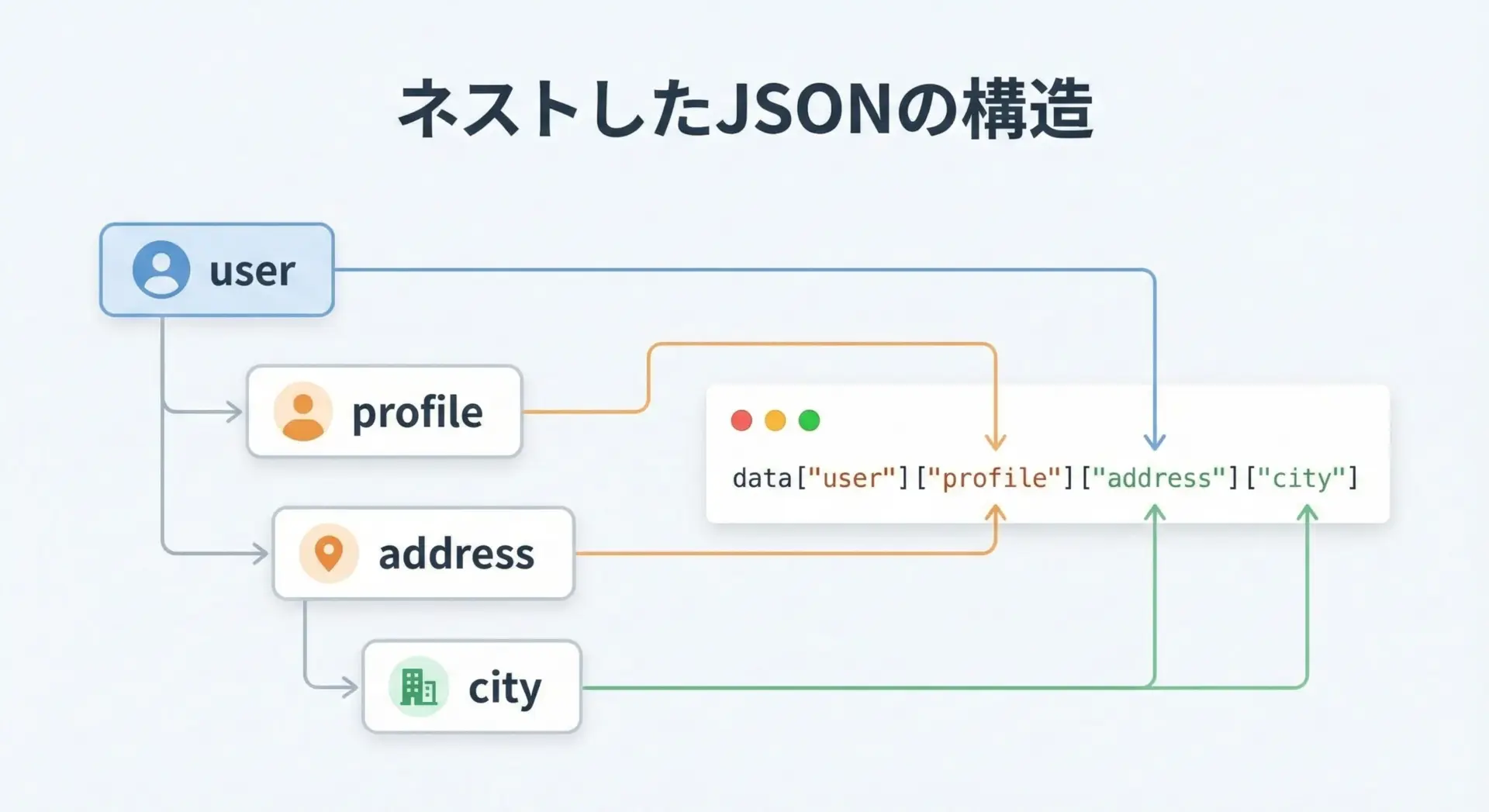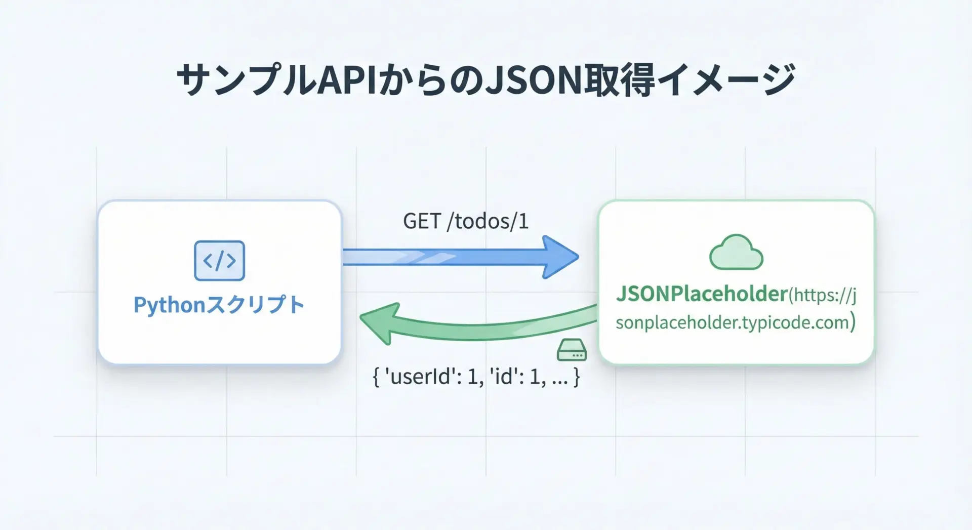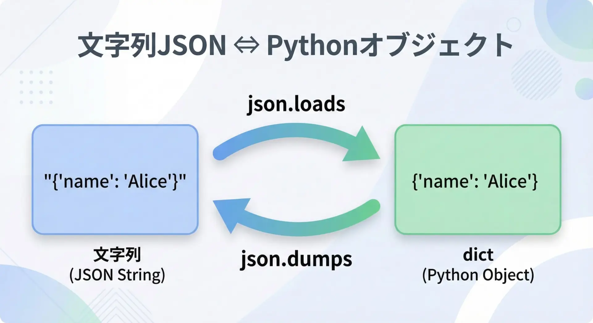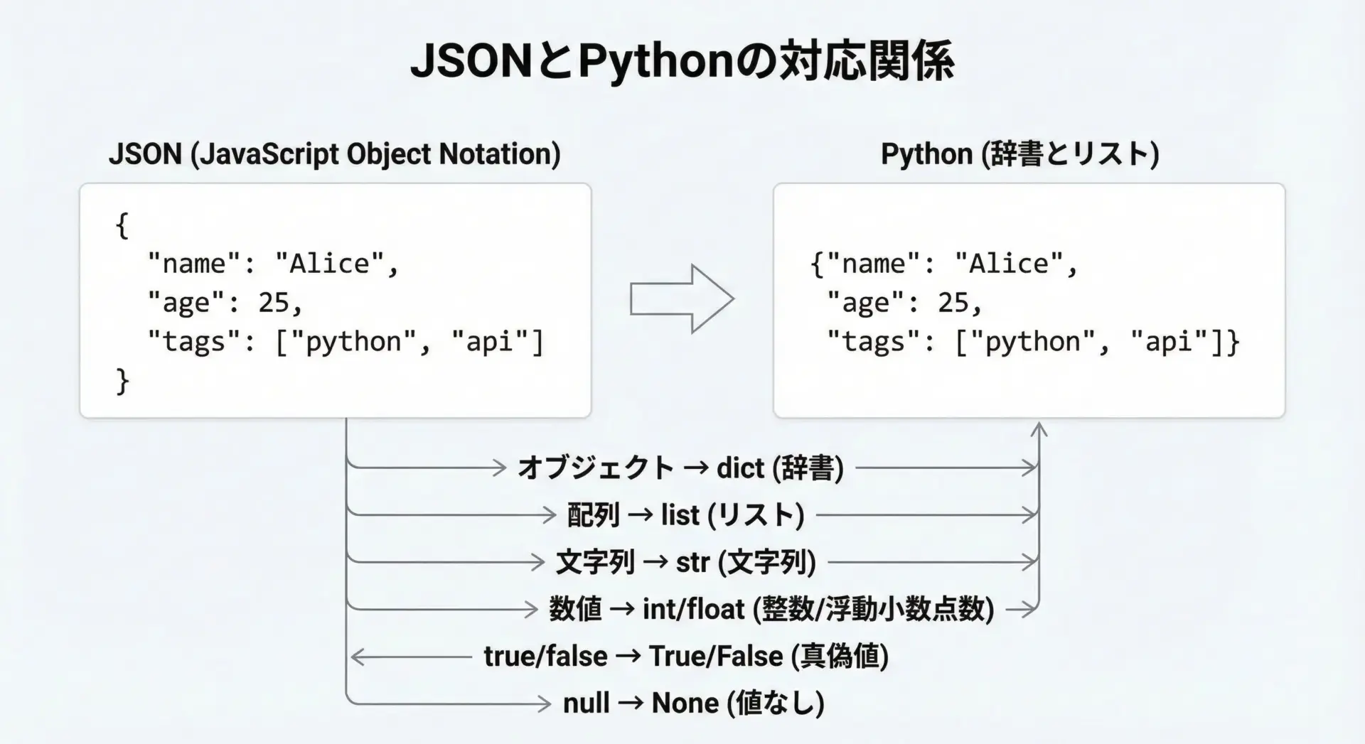 このように、JSONのオブジェクトはPythonのdict、JSONの配列はPythonのlistに対応しているため、Pythonでの処理が非常に自然になります。