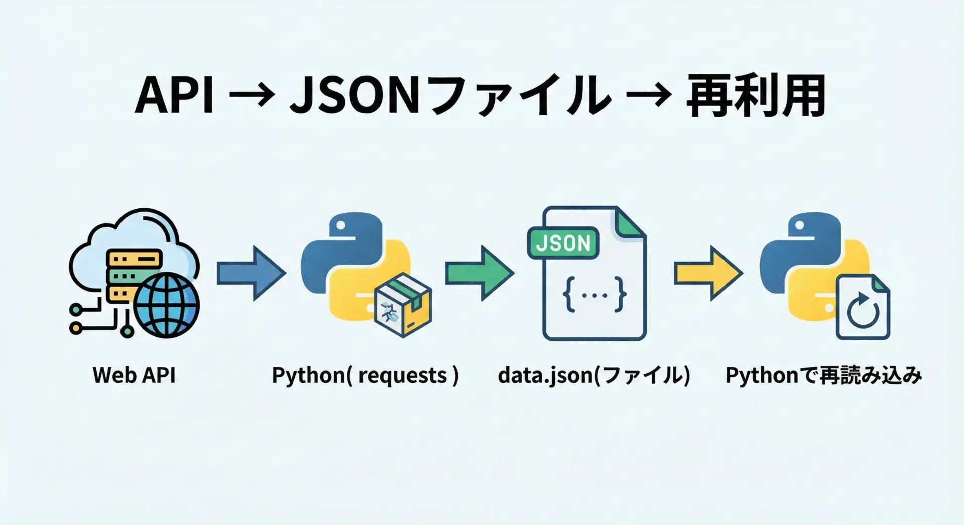 Web APIから取得したJSONデータは、その場で使い捨てにするのではなくファイルに保存しておくことで、後から再利用したり、他のツールに渡したりできます。