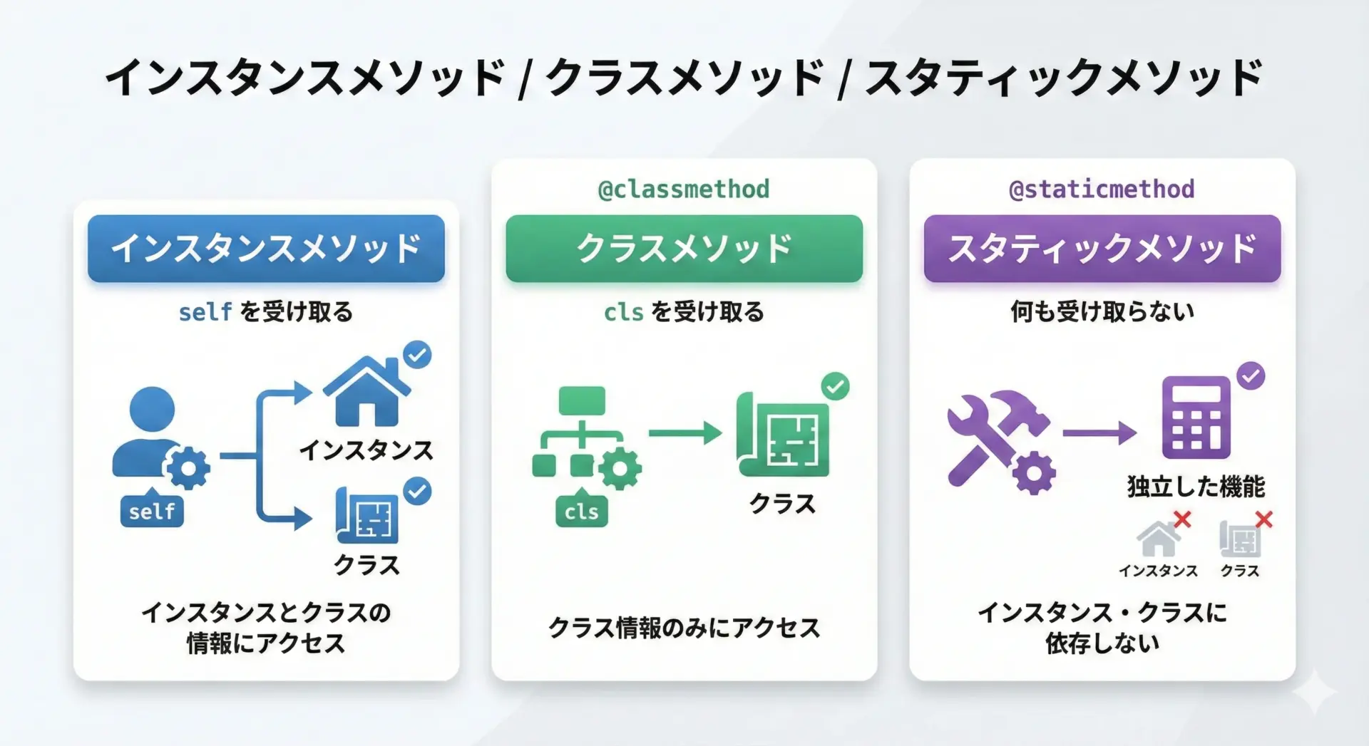 インスタンス生成とコンストラクタ、selfの意味、カプセル化や継承・オーバーライドといったオブジェクト指向の基本要素、さらに抽象クラスやdataclassまで押さえることで、現実世界の構造に近い形でプログラムを組み立てられるようになります。