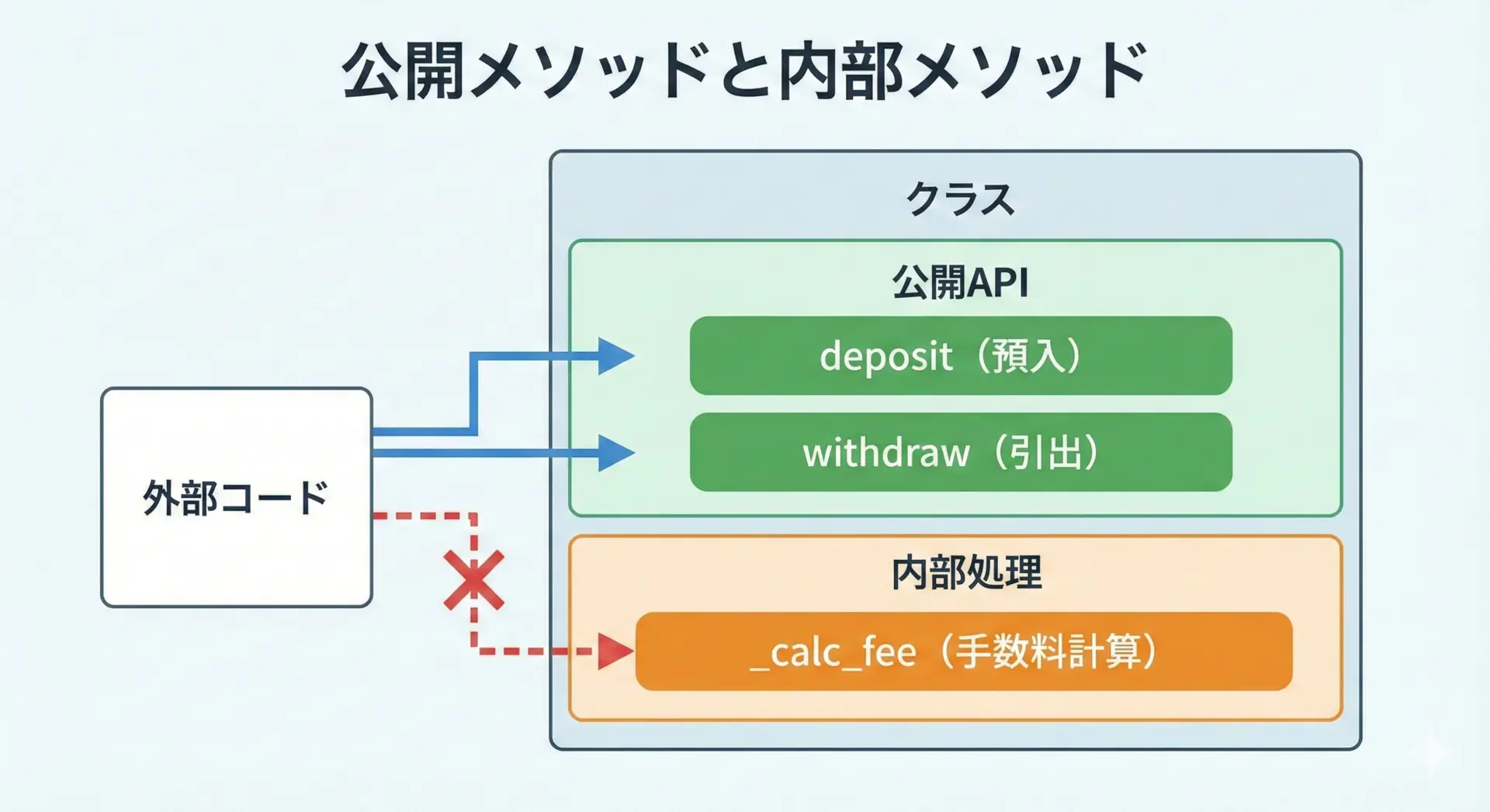 これは、データとそれを扱う処理をひとまとめにし、必要な窓口だけを外側に公開するという考え方です。