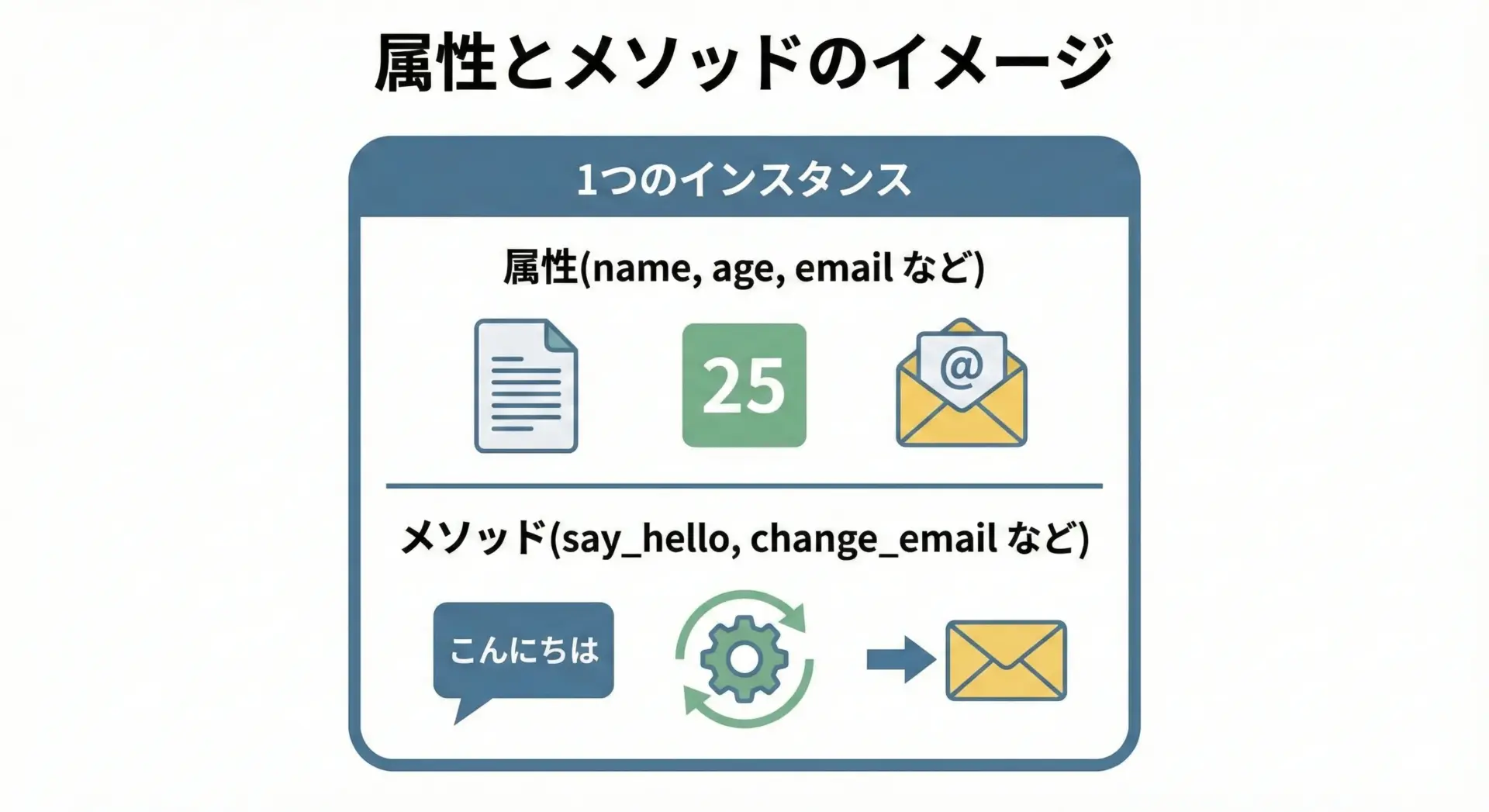 ユーザーなら自己紹介する、年齢を1つ増やす、商品なら在庫を減らす、価格を変更するといった処理がメソッドにあたります。