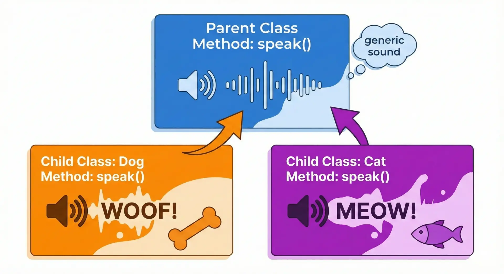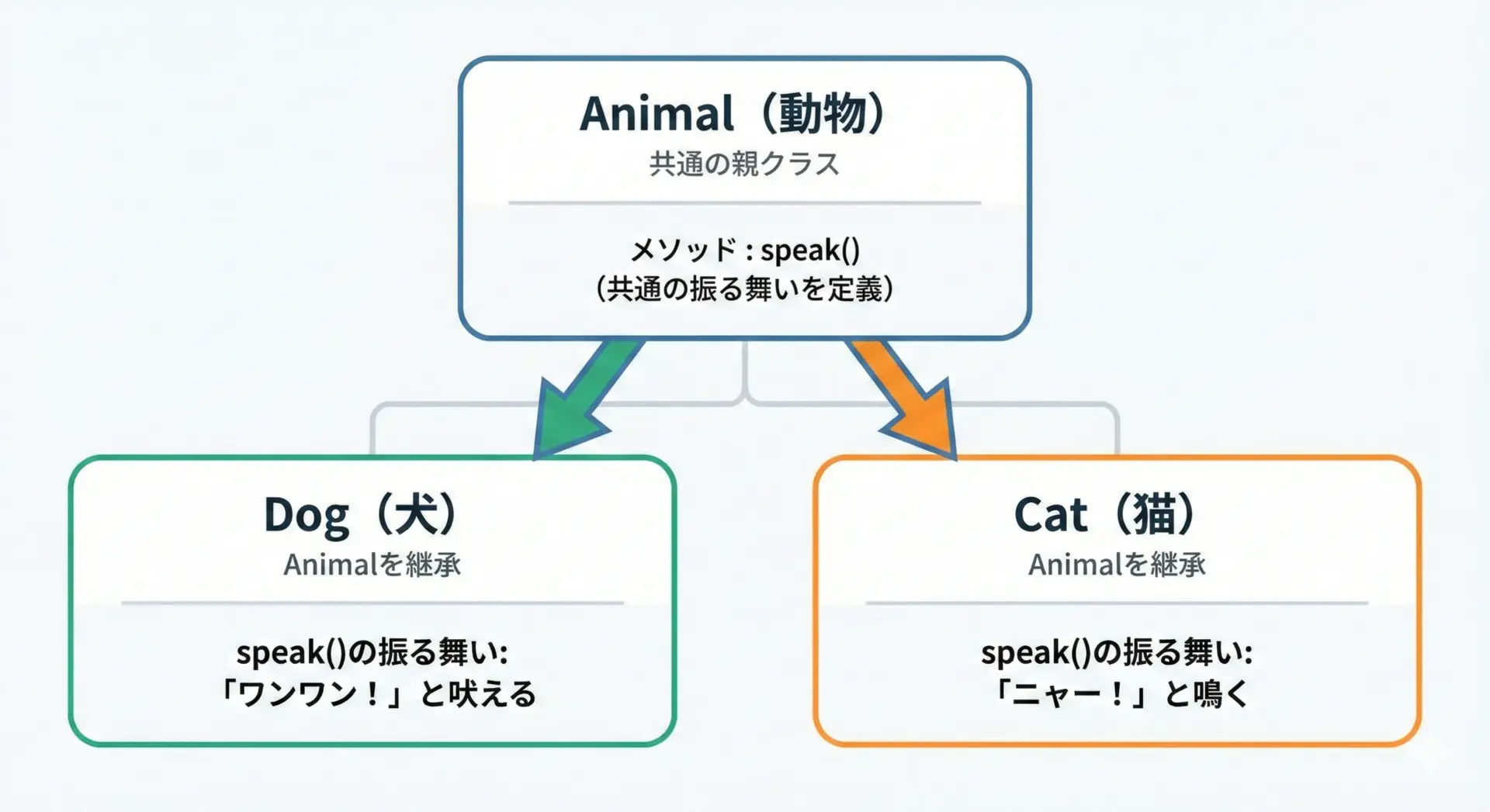 このように、同じインターフェース(ここではspeakメソッド)を持ちながら、クラスごとに異なる振る舞いをさせられるのがオーバーライドの特徴です。