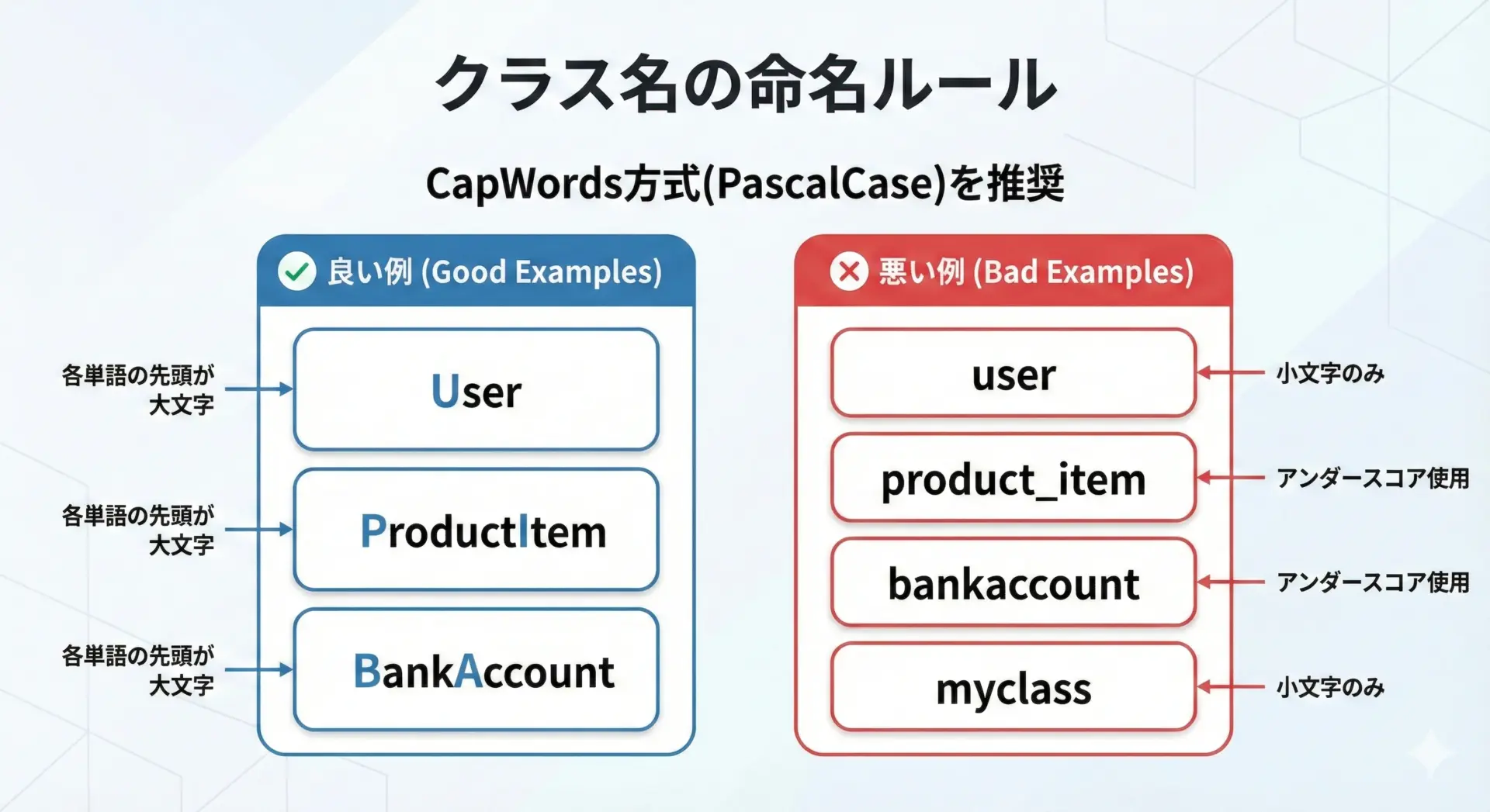 逆に、変数名や関数名で使われるuserやproduct_itemといったスネークケースは、クラス名には基本的に使いません。