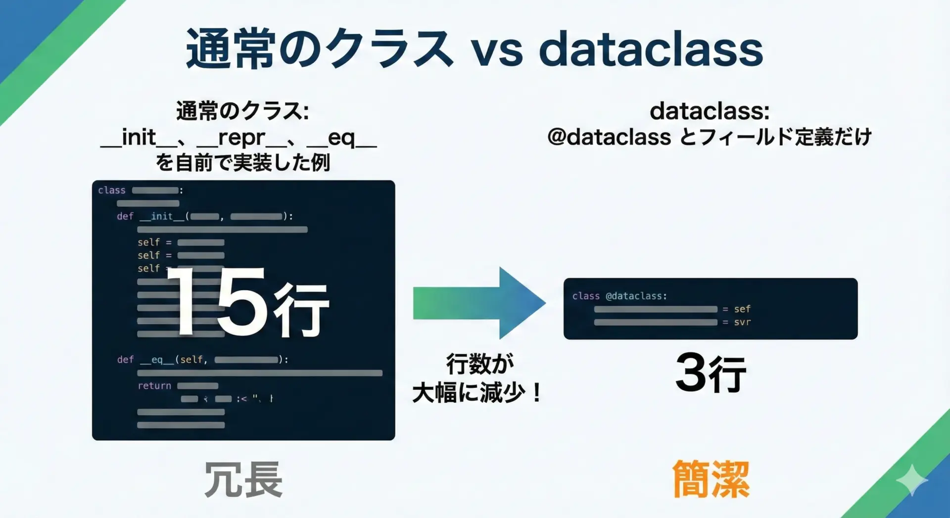 データクラスを使うと、__init__や__repr__、__eq__などのメソッドを自動生成してくれるため、コードを大幅に短くできます。