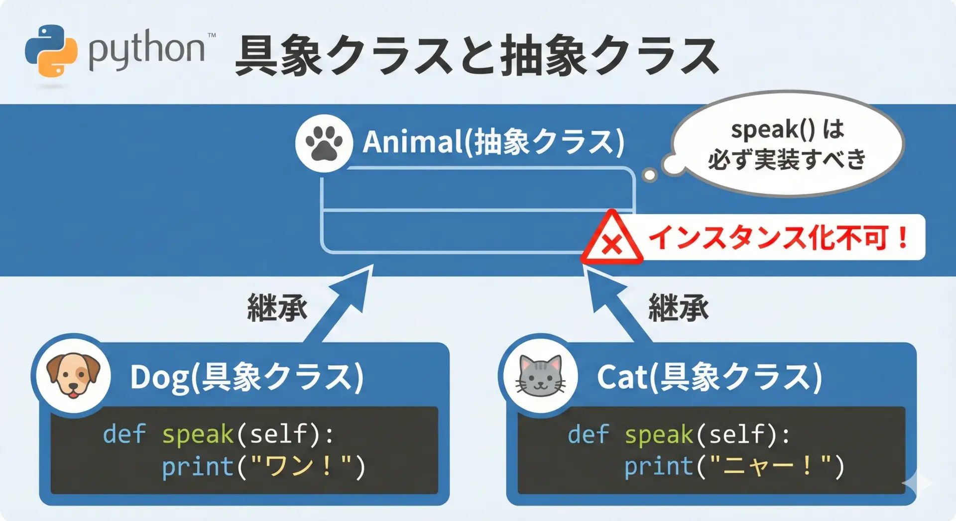 抽象クラスには@abstractmethodを付けたメソッドを含めることができ、そのクラスを継承する子クラスは、必ずそのメソッドを実装しなければならないというルールを表現できます。