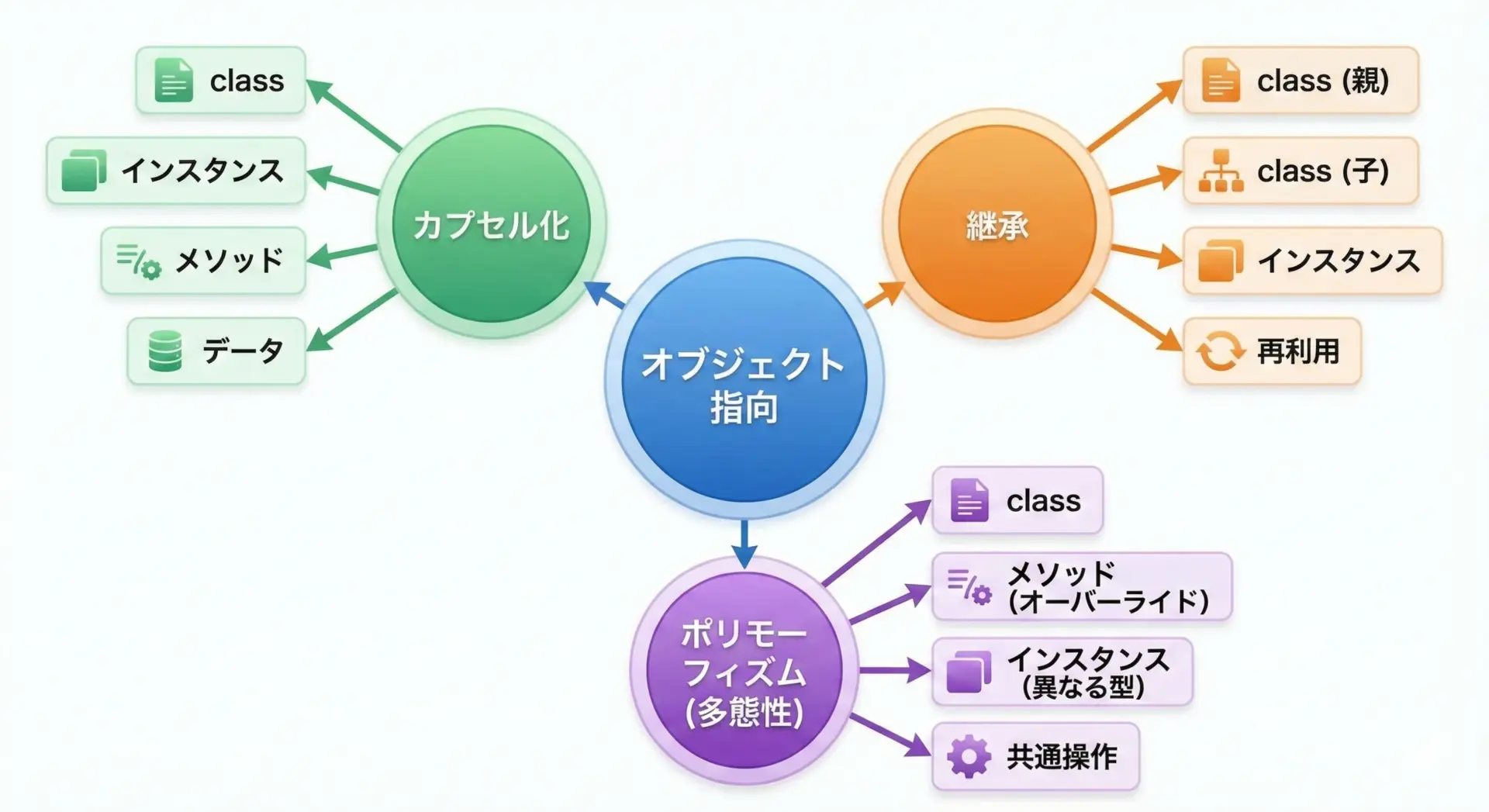 このように、共通の性質を持つクラスを親クラスにまとめ、具体的な種類ごとに子クラスを作ることで、コードの重複を減らし、構造を整理できます。