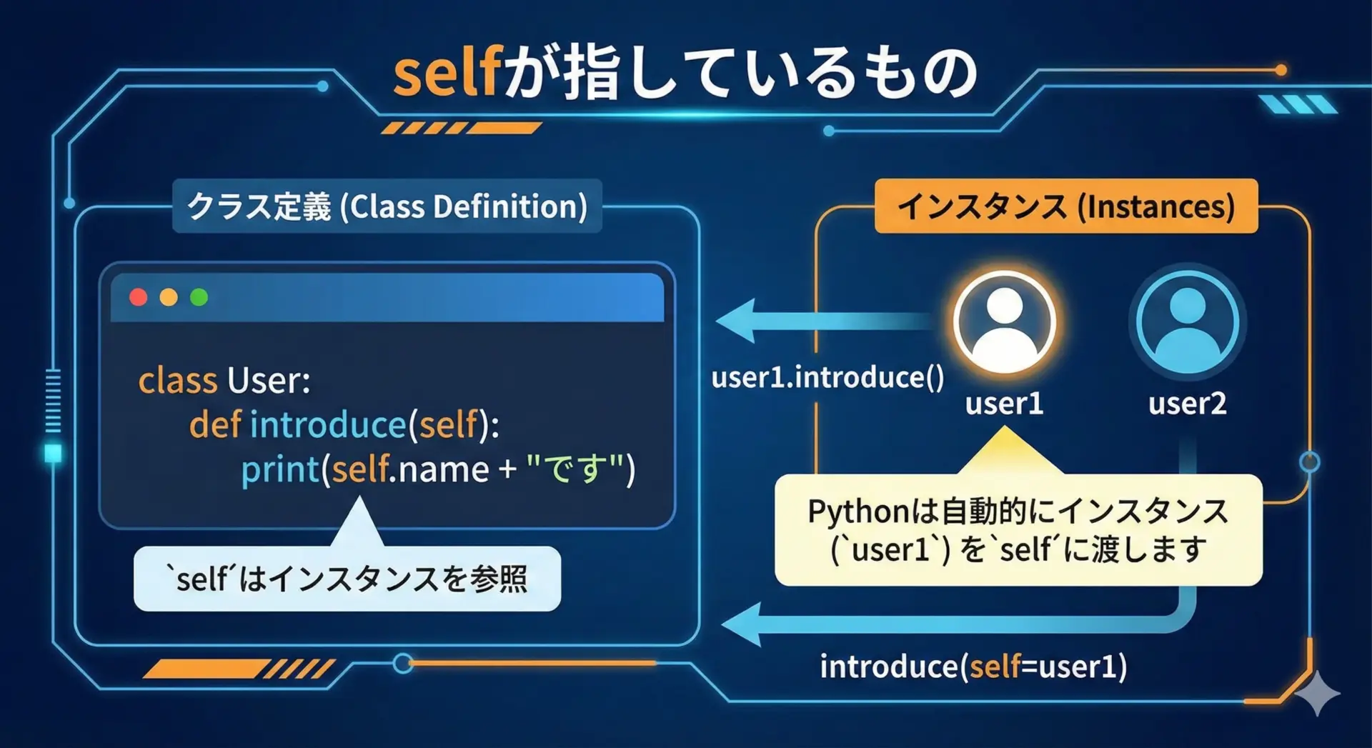 Pythonでは、どちらもself.名前という形で扱う点がポイントです。