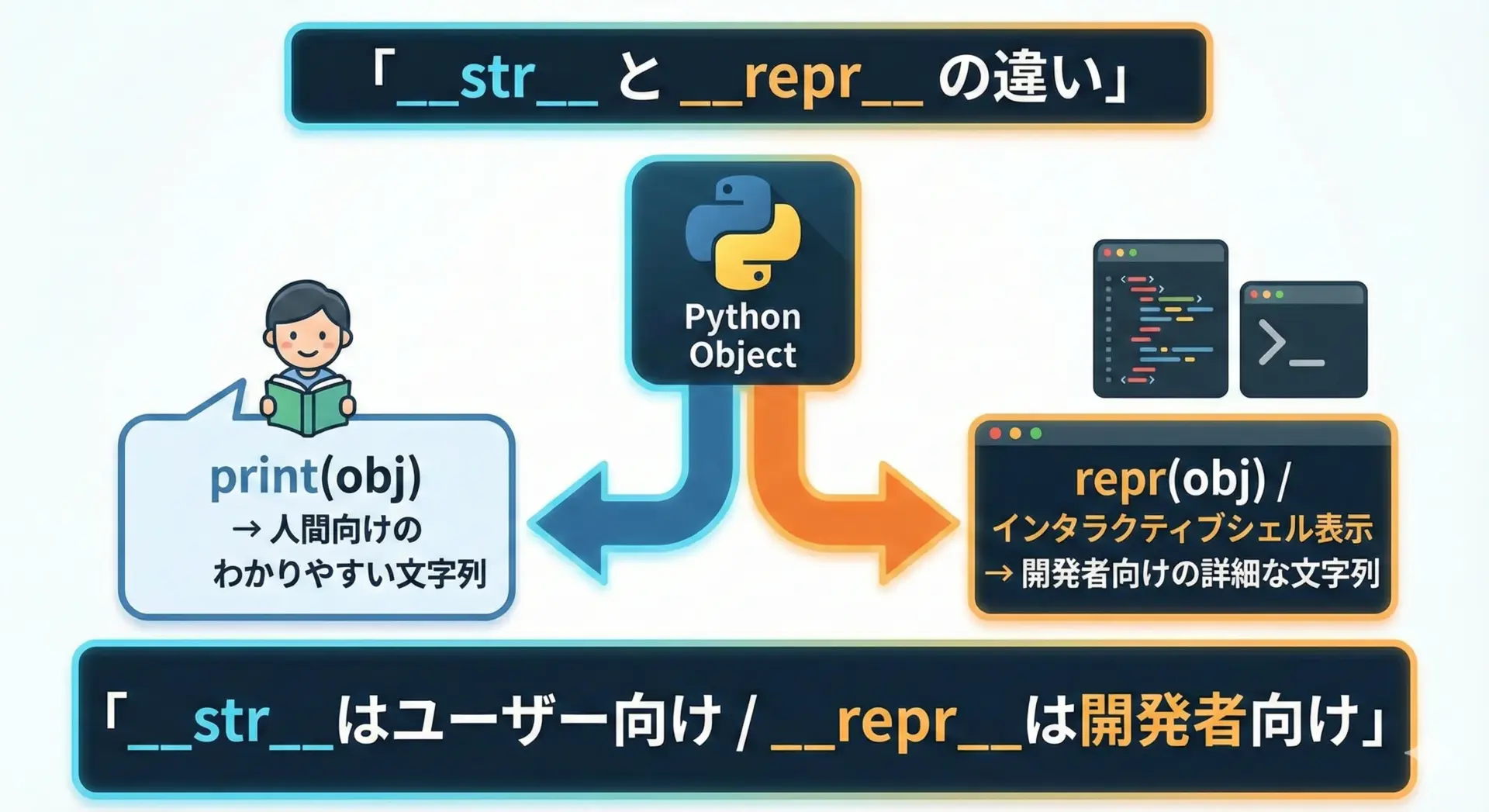 このように__str__や__repr__を実装しておくと、デバッグやログ出力がとても見やすくなり、開発効率が上がります。