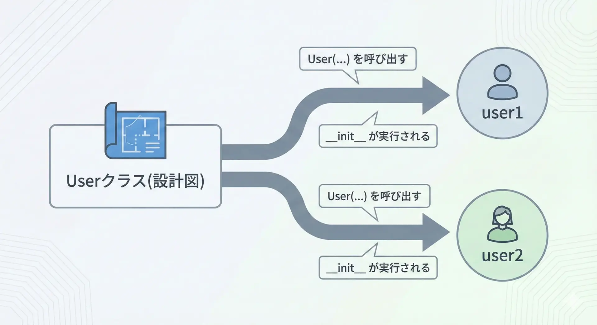 この例では、User("太郎")と書いたときに__init__(self, name)が呼ばれ、nameという引数に"太郎"が渡されています。