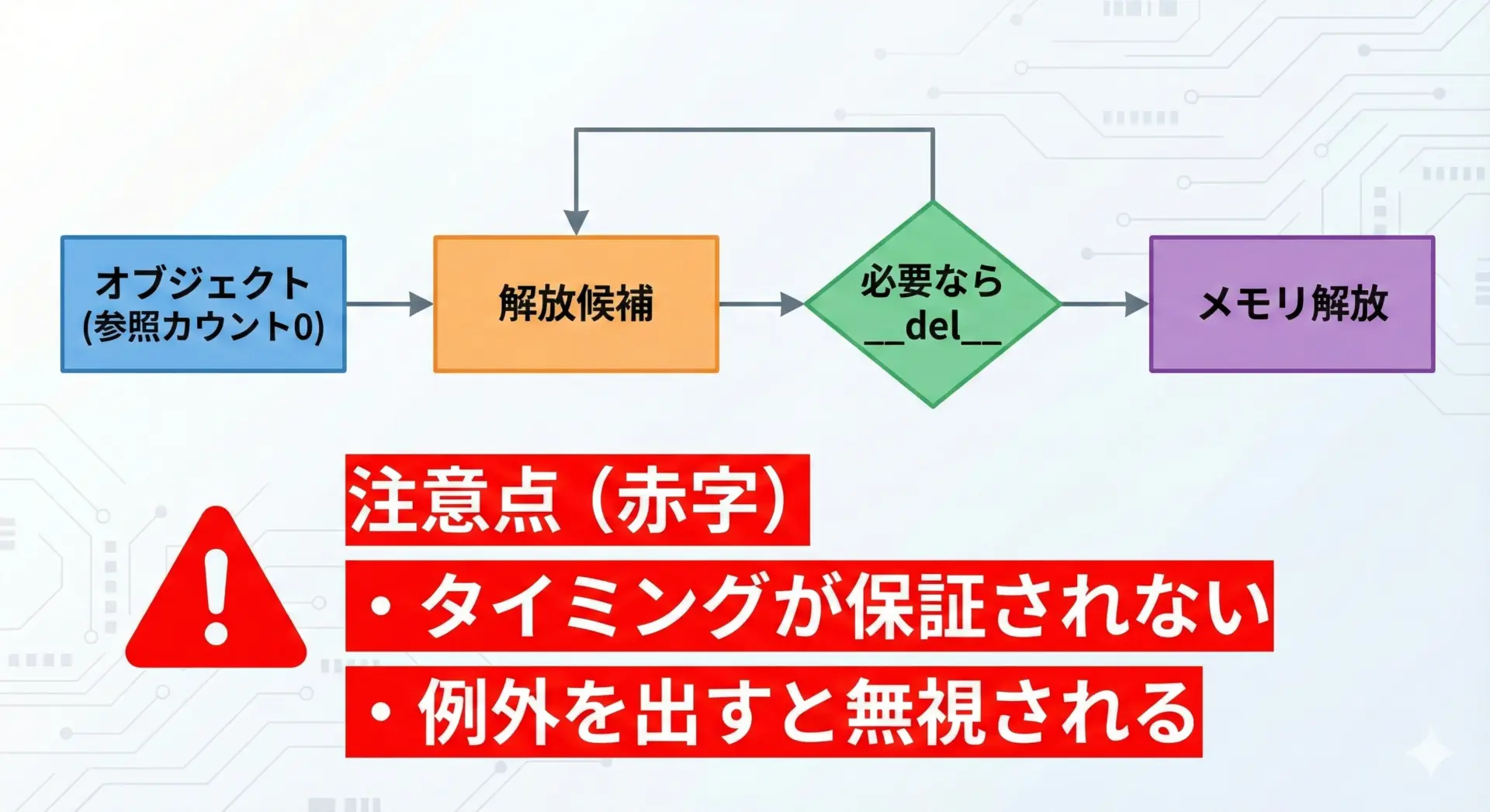 実際にはインタプリタの実装や参照サイクルの有無などで挙動が変わるため、ファイルやネットワークリソースの解放にはwith文と__enter__/__exit__を使うのが安全です。