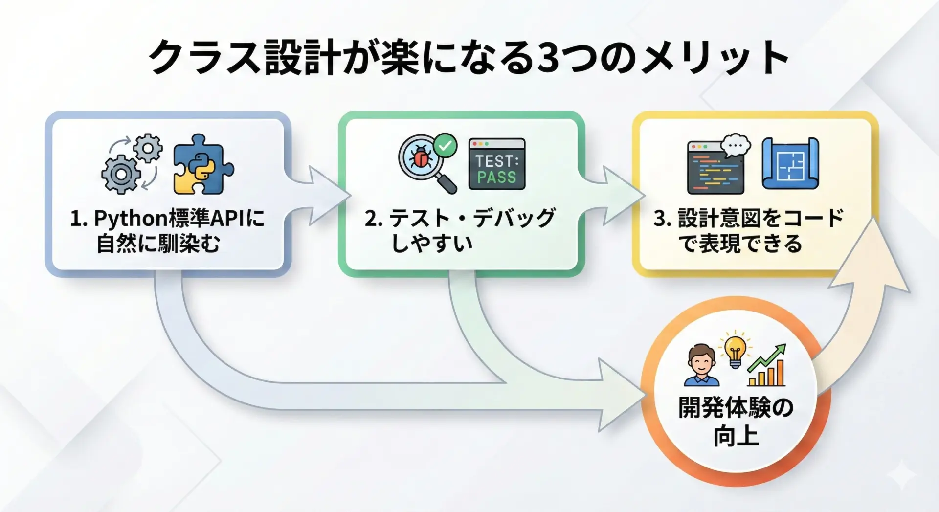 本記事で紹介した主な特殊メソッドの一覧と実用パターンを押さえておけば、自作クラスを標準ライブラリと同じような感覚で自然に扱えるようになります。