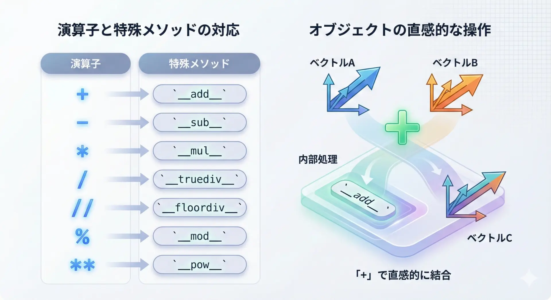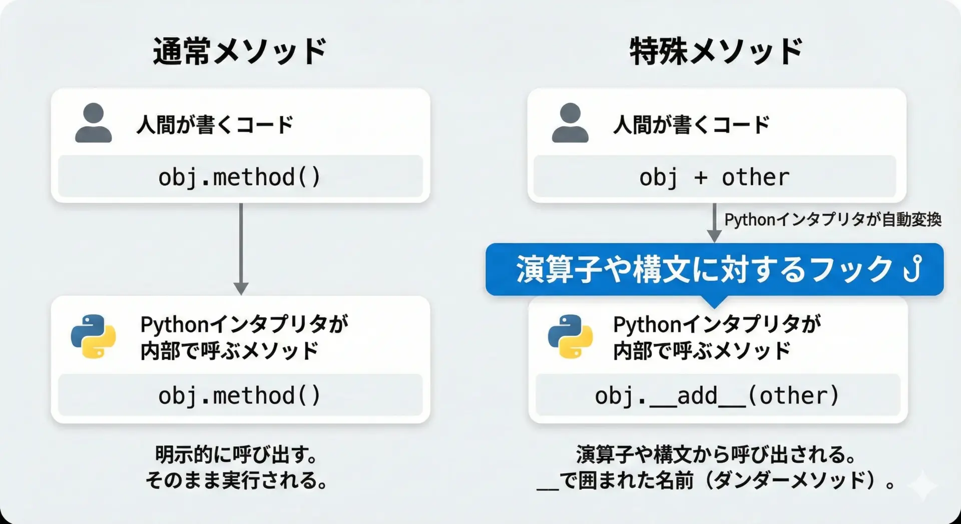Pythonの特殊メソッドは、クラスに「Pythonらしいふるまい」を与えるための強力な仕組みです。